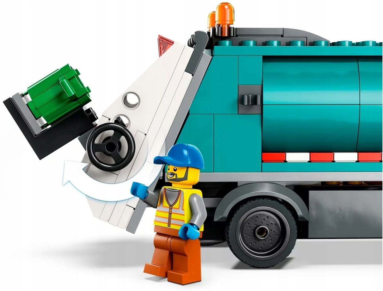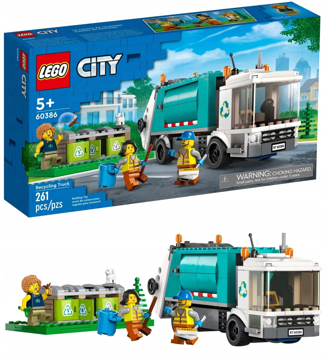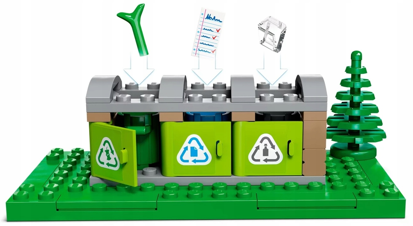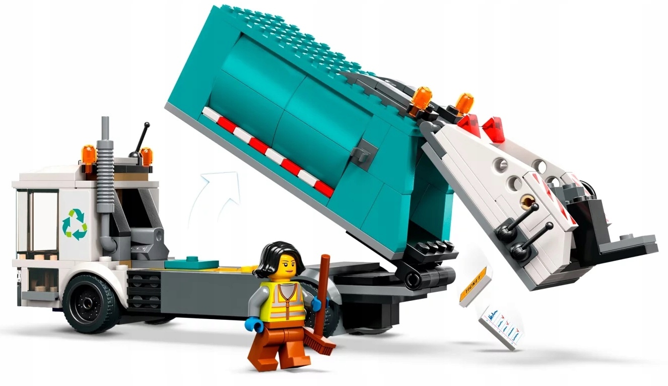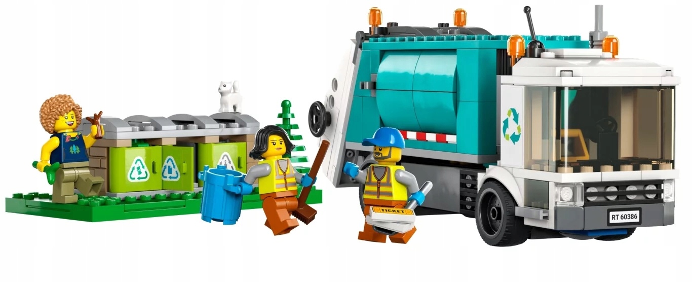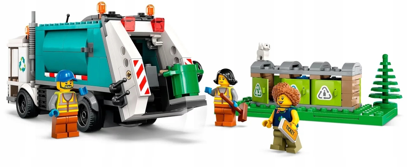 - Co jest w pudełku? – Wszystko, czego potrzebują dzieci do zbudowania ciężarówki recyklingowej LEGO® City, a także zabawkowe centrum recyklingu z trzema pojemnikami, trzy minifigurki i figurkę kota