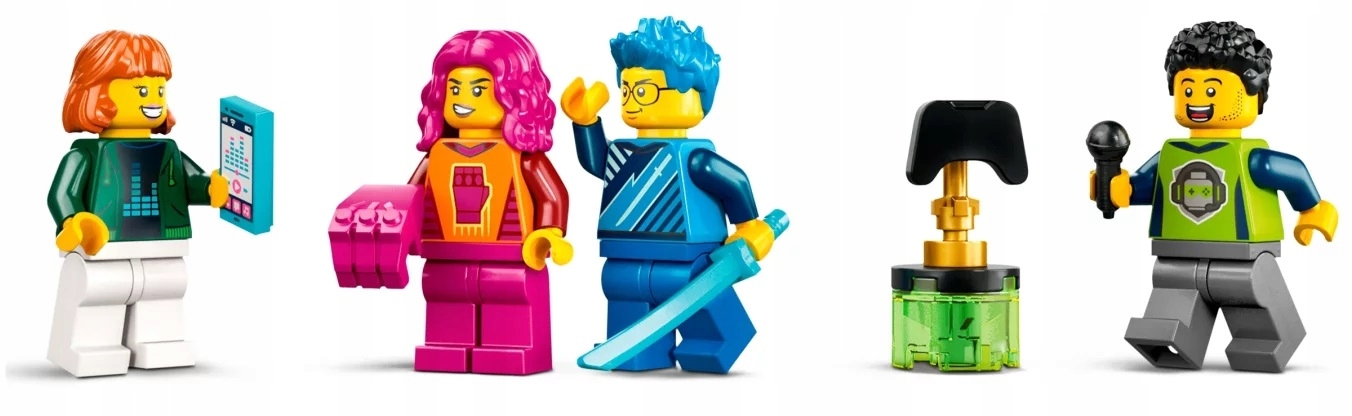 - Akcesoria dla minifigurek – Akcesoria obejmują trofeum dla zwycięzcy, mikrofon, telefon oraz elementy gamingowe, w tym wielkie pięści i miecz