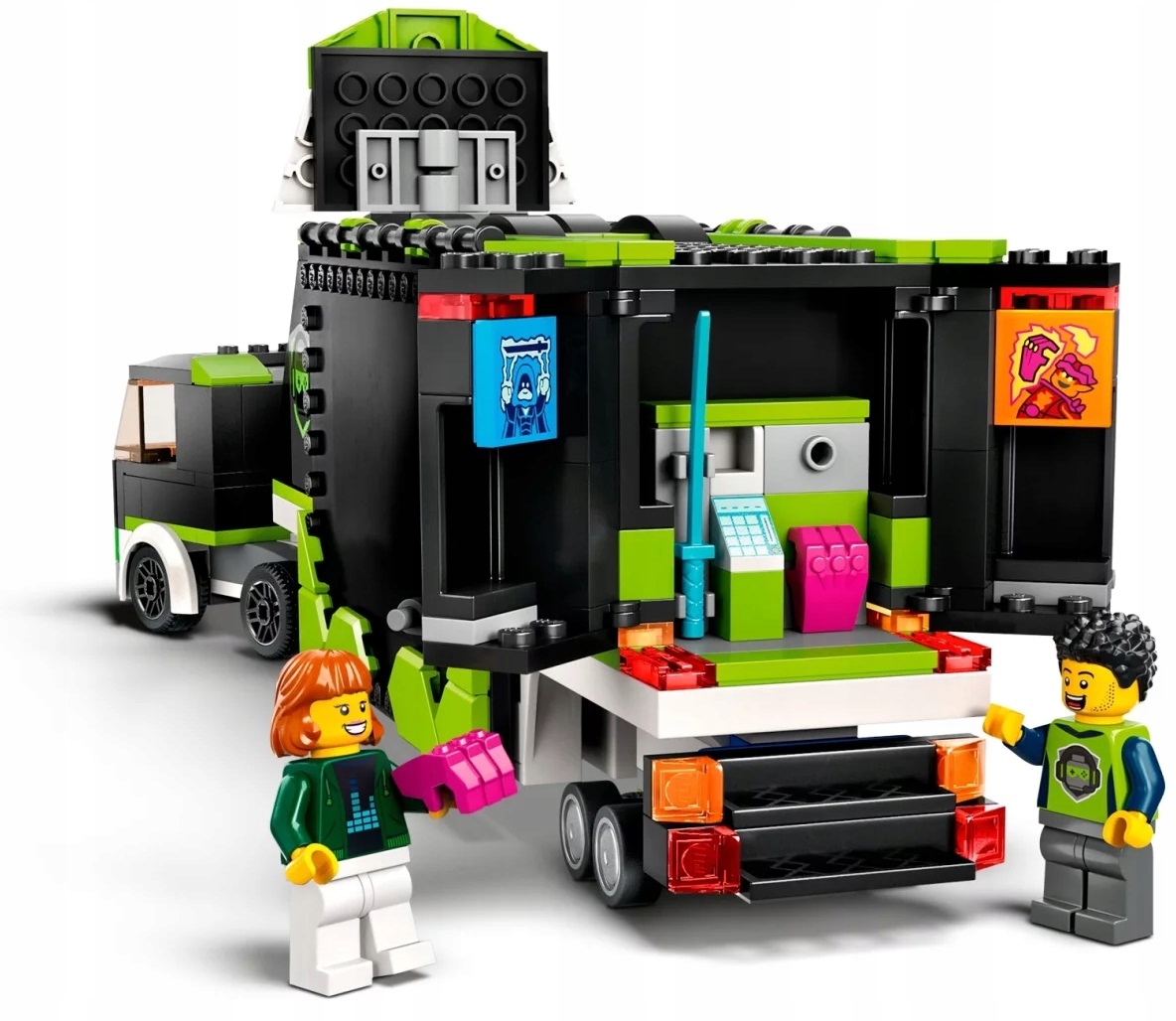 - Co jest w pudełku? – Wszystko, czego potrzebują dzieci do zbudowania ciężarówki na turniej gier ze sceną, dwoma stanowiskami do gier, telebimem, trofeum dla zwycięzcy, produktami i trzema minifigurkami