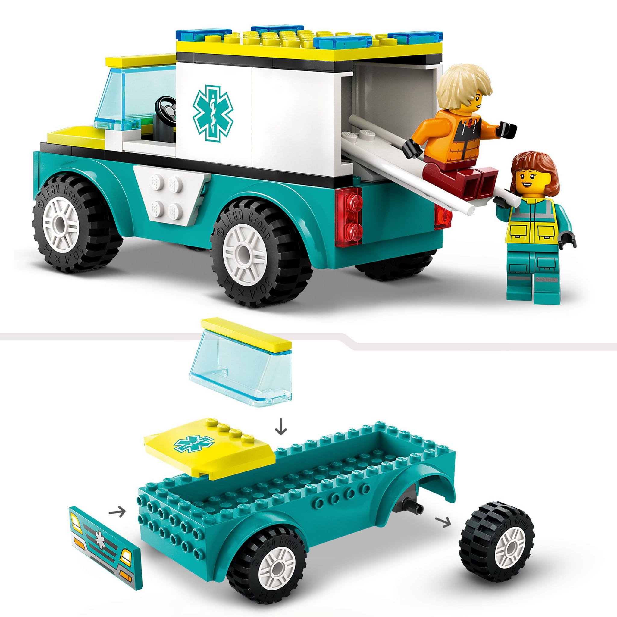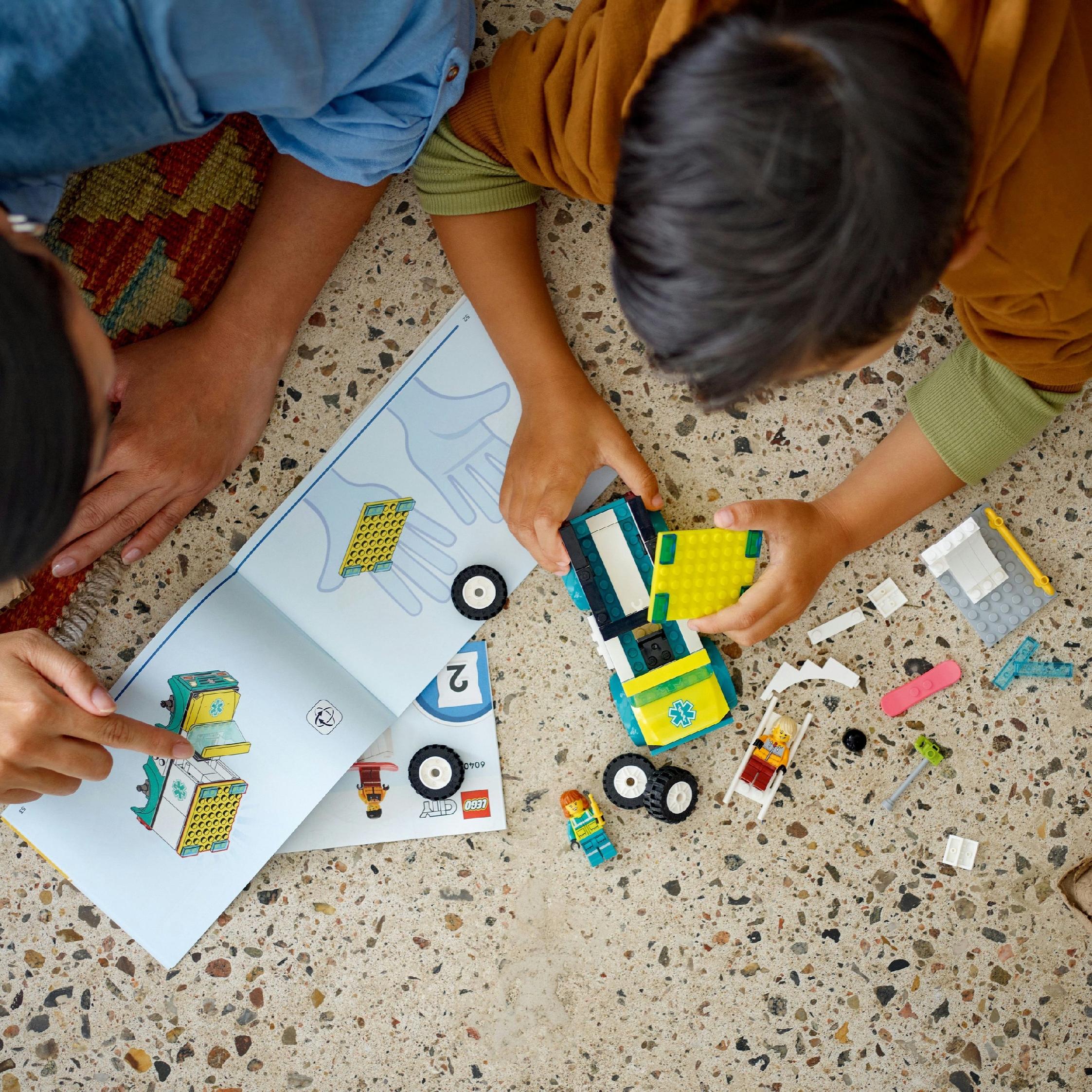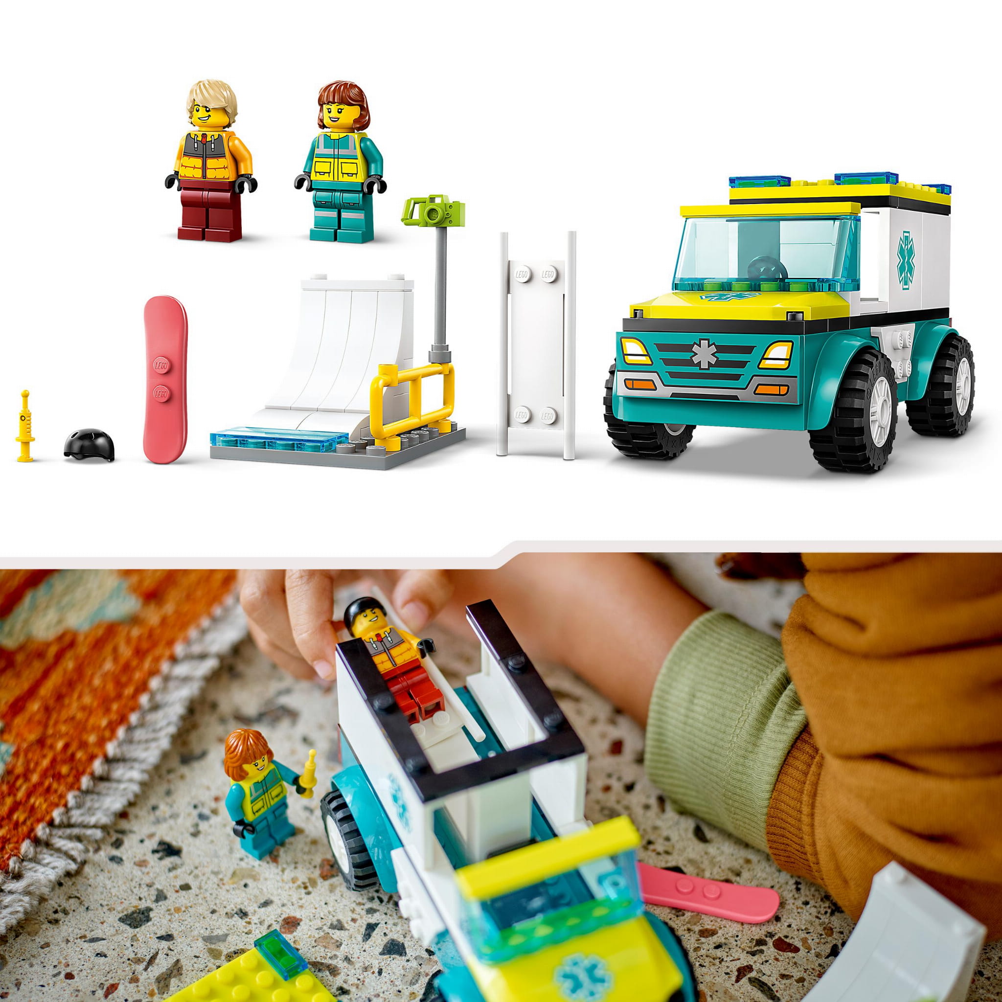 - Zestaw z karetką — dołącz do małych budowniczych podczas zabawy zestawem LEGO® City Karetka i snowboardzista dla czterolatków i starszych dzieci