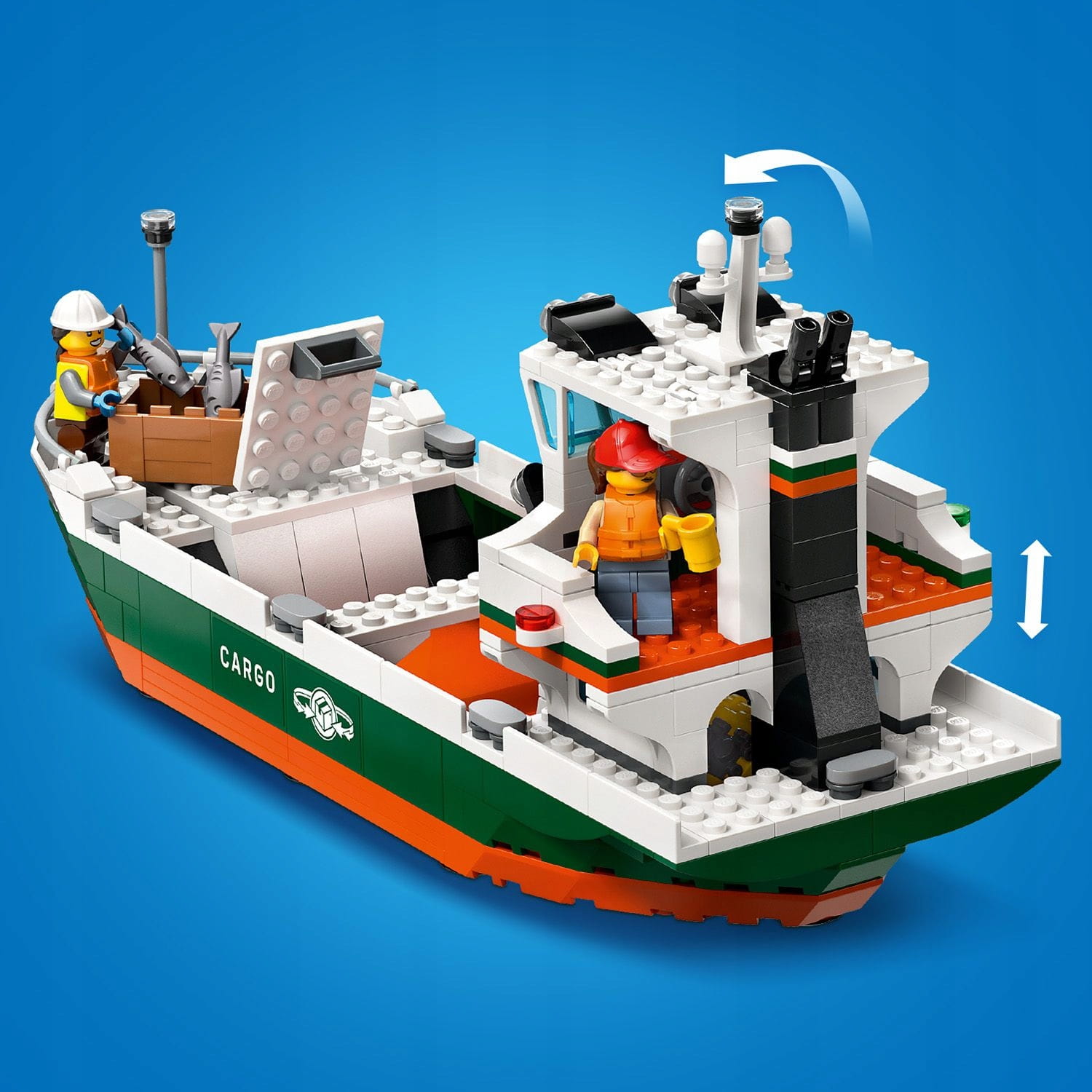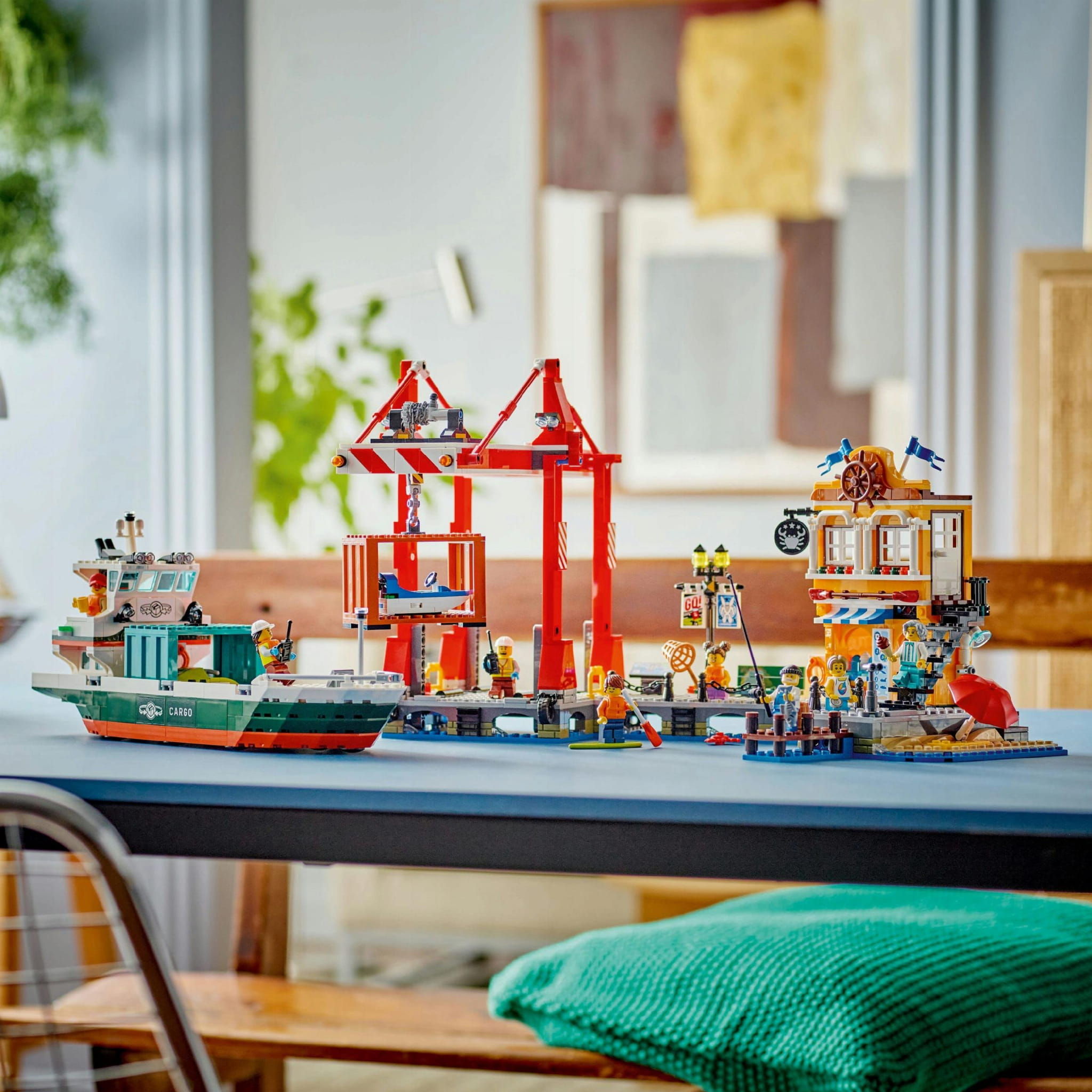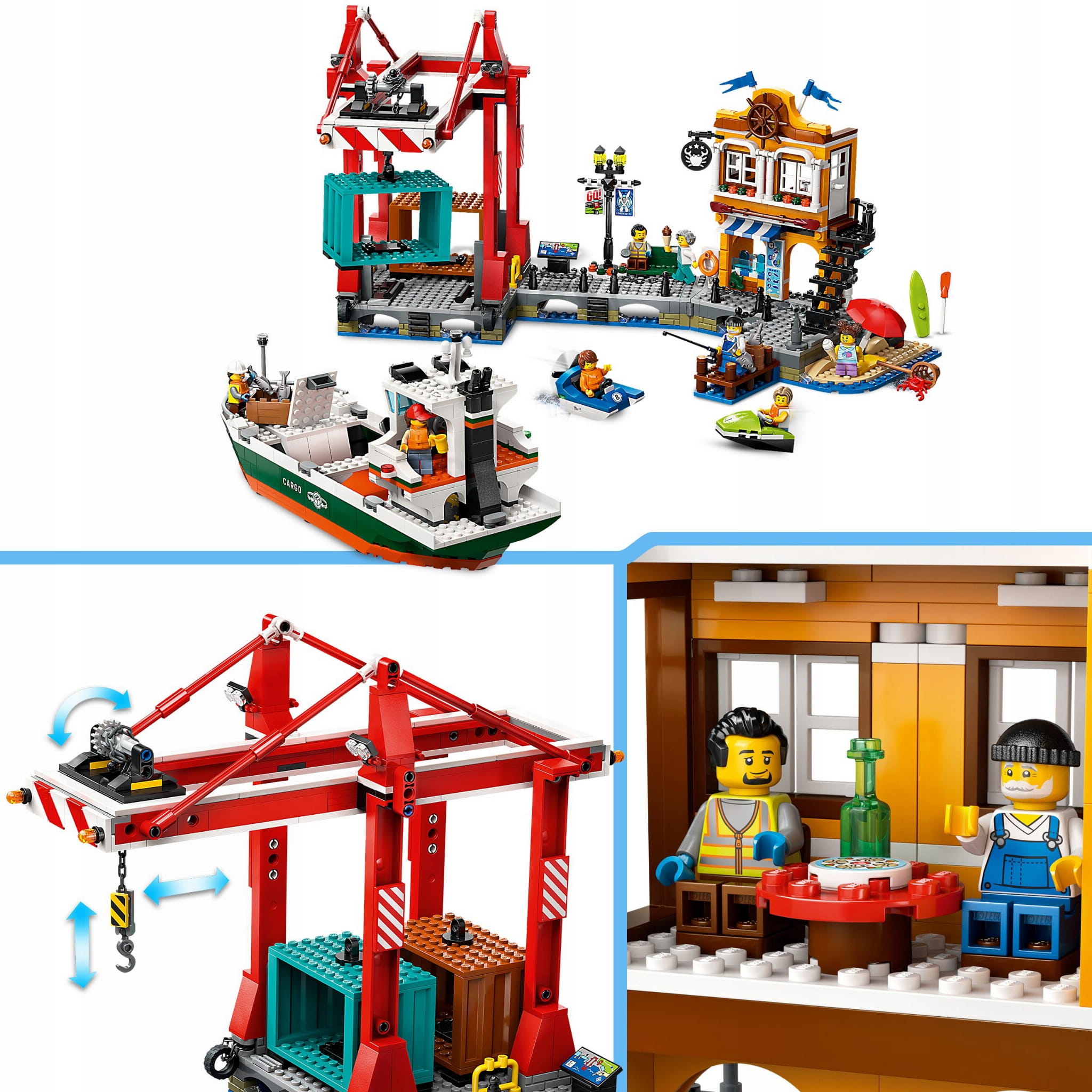 - Zawartość pudełka — ten zestaw zawiera statek LEGO®, dwa kontenery towarowe, działający dźwig kontenerowy, port ze sklepem i restauracją, skuter wodny, łódź i osiem minifigurek