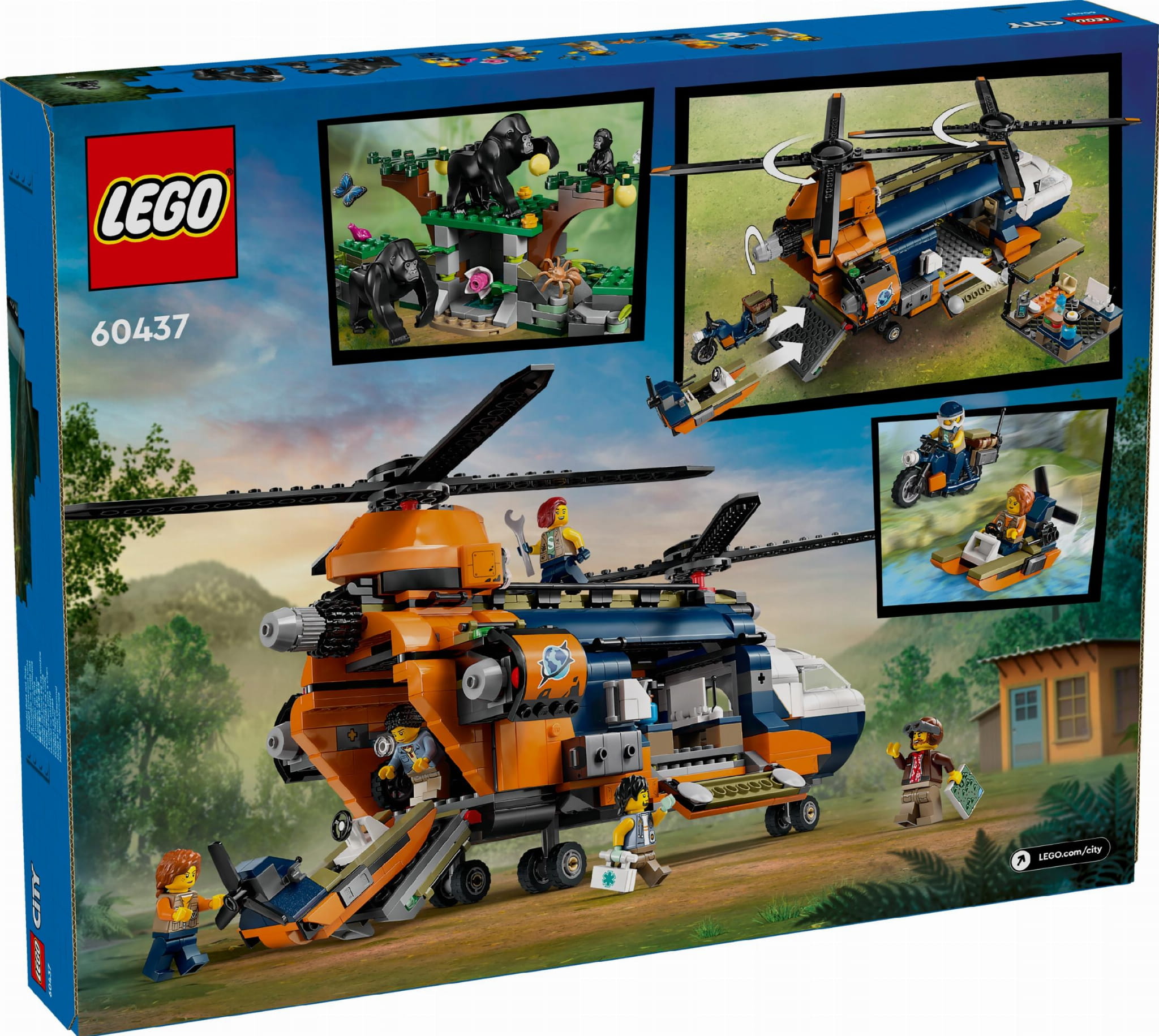 Podaruj małym odkrywcom w wieku od ośmiu lat zestaw LEGO® City Helikopter badaczy dżungli w bazie (60437) z realistycznym, dwuwirnikowym helikopterem, dwiema ładowniami i działającą wyciągarką.