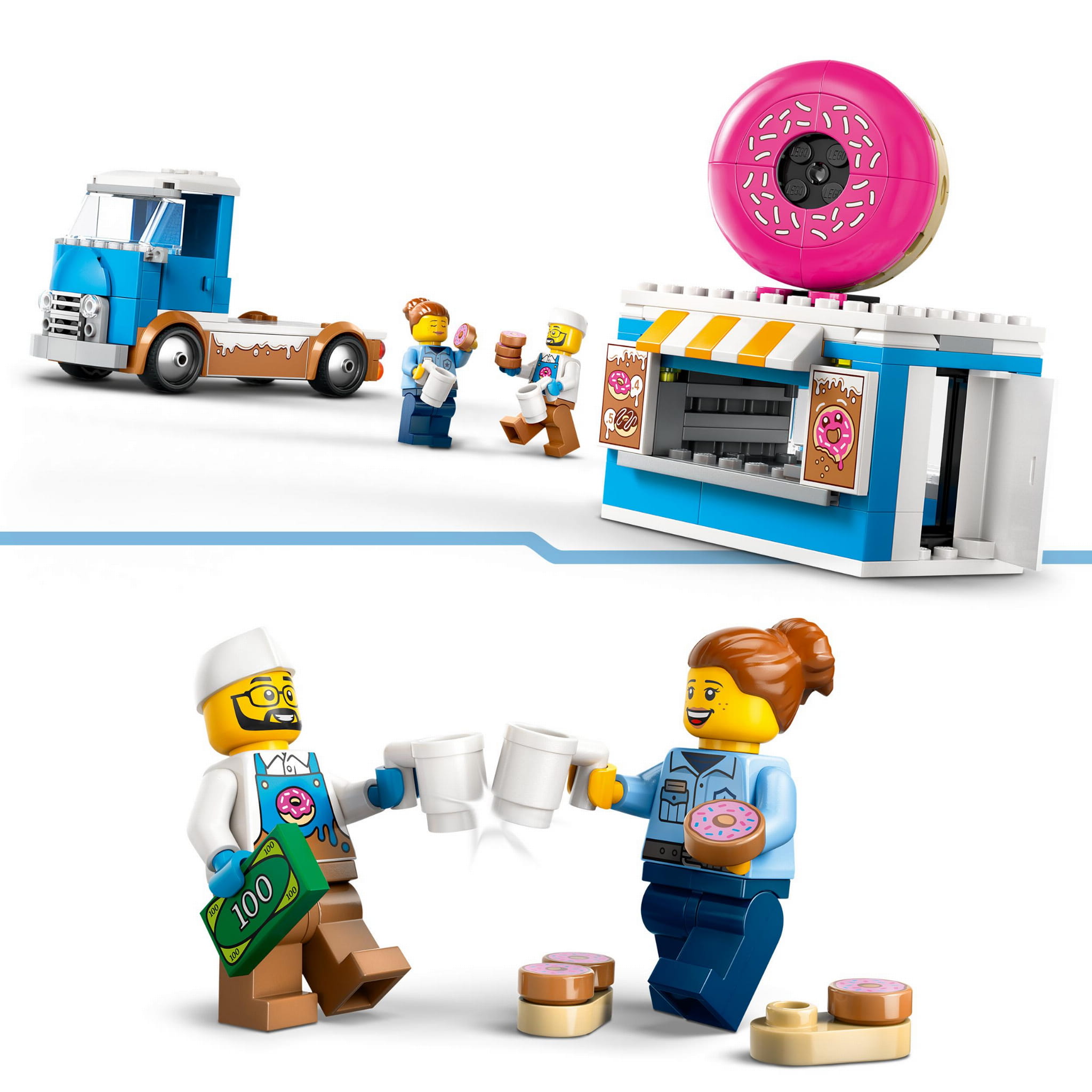 Dzieci mogą serwować smaczne pączki i napoje z okienka i odczepiać kiosk, aby poszerzyć możliwości zabawy. Wystarczy dodać minifigurki sprzedawcy i klienta, by rozpocząć zabawę na całego!