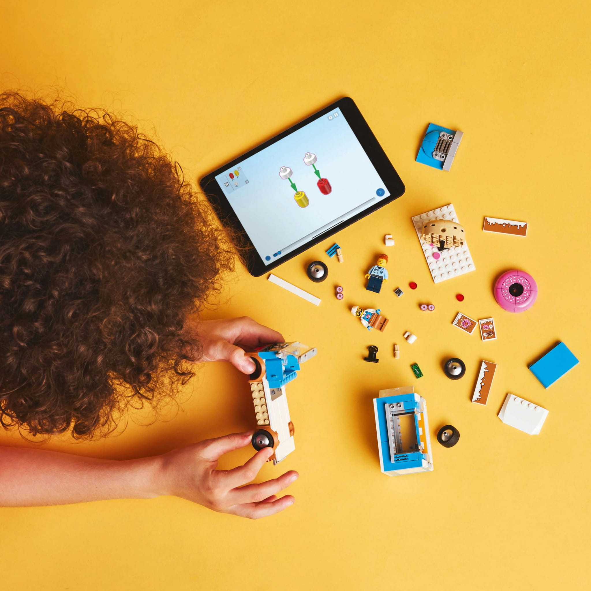- Zawartość zestawu — zestaw zawiera wszystko, czego dzieci potrzebują do zbudowania mobilnej pączkarni z odczepianym kioskiem, a także minifigurki sprzedawcy i klienta oraz mnóstwo akcesoriów