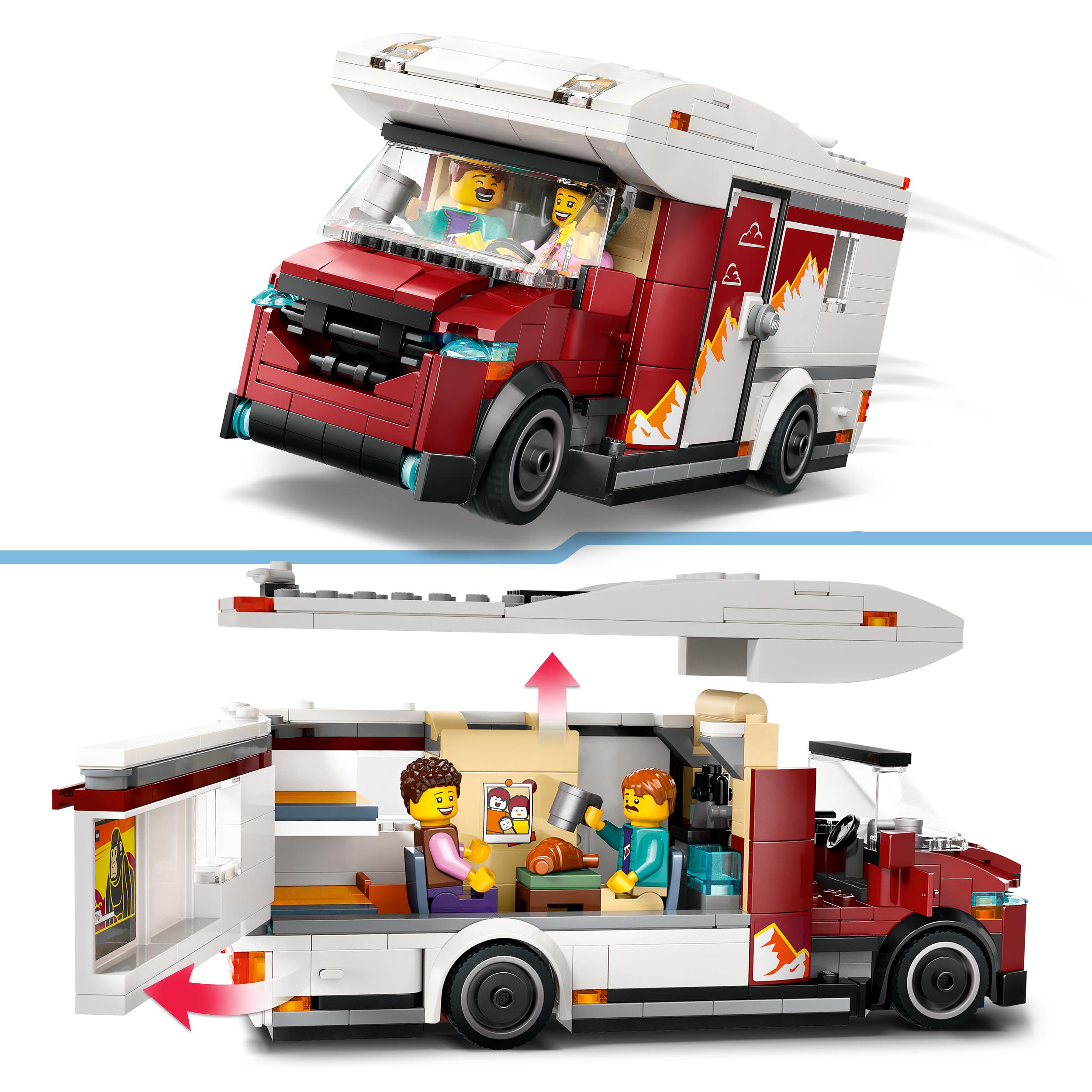 - Zestaw z zabawkowym kamperem — dzięki temu zestawowi konstrukcyjnemu LEGO® City Wakacyjny kamper pełen przygód sześciolatki i starsze dzieci mogą cieszyć się wakacjami każdego dnia