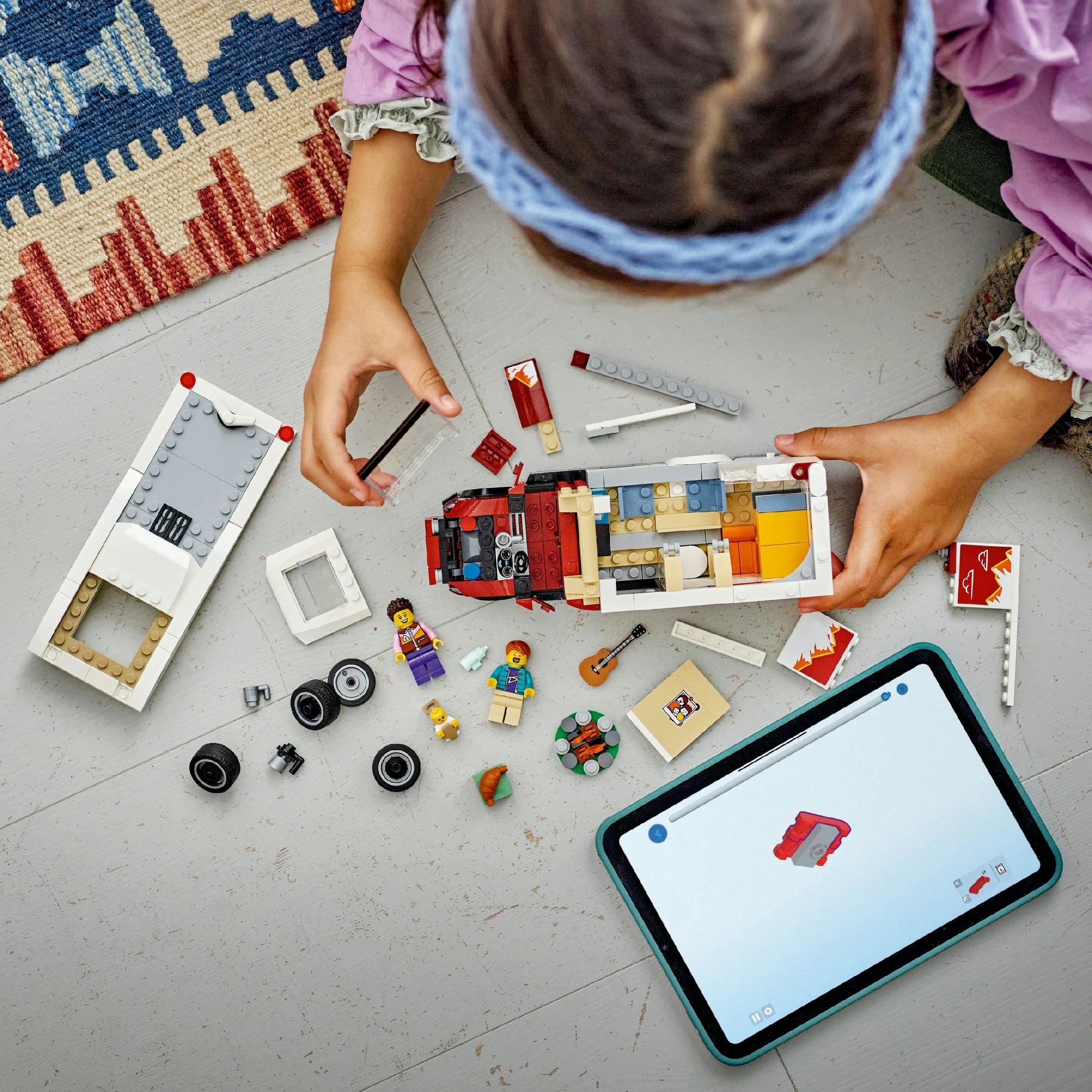 - Zawartość zestawu — zestaw zawiera wszystko, czego dzieci potrzebują, by zbudować kampera z przestrzenią mieszkalną, a także ognisko, dwie minifigurki i figurkę dziecka