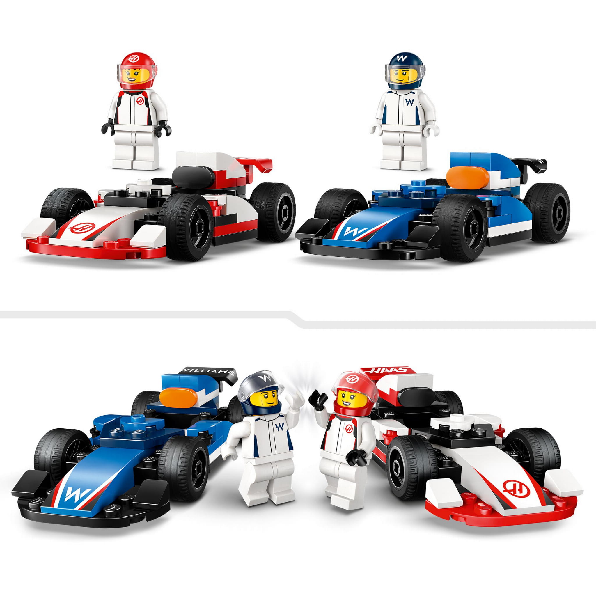 - Zawartość zestawu — zestaw zawiera wszystko, czego dzieci potrzebują do zbudowania dwóch bolidów Formuły 1® oraz minifigurki kierowców zespołów Williams Racing i Haas