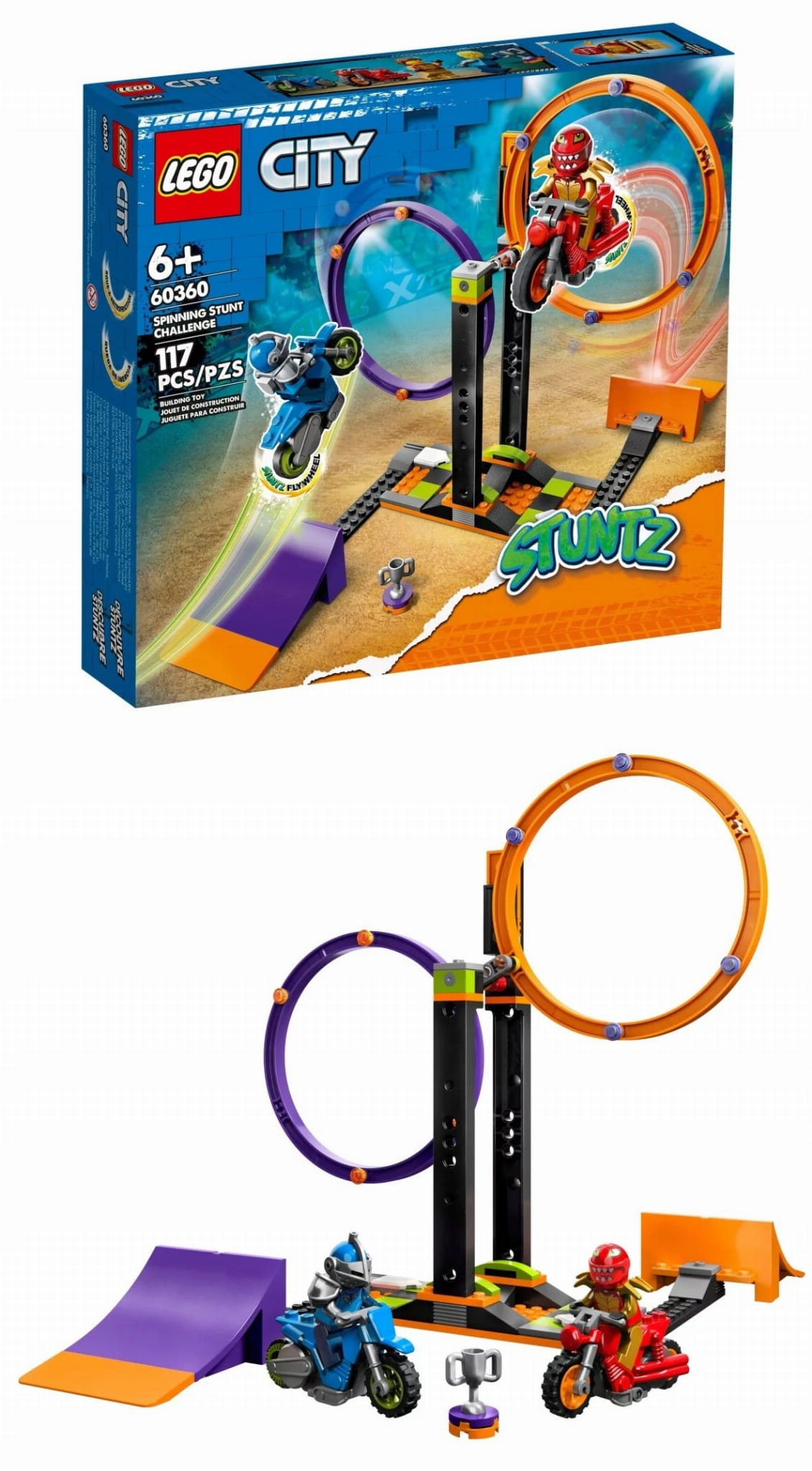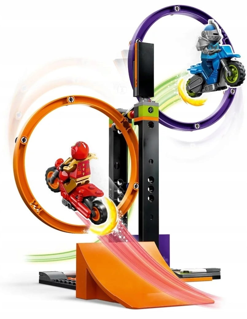 Dzięki zestawowi LEGO® City Wyzwanie kaskaderskie – obracające się okręgi (60360), który zawiera obracaną podwójną obręcz do przeskakiwania, dwie rampy i dwa motocykle kaskaderskie napędzane kołem zamachowym dzieci w wieku od sześciu lat mogą urządzać ekscytujące pokazy, gry i konkursy.
