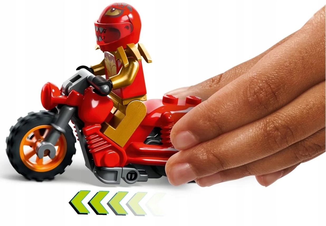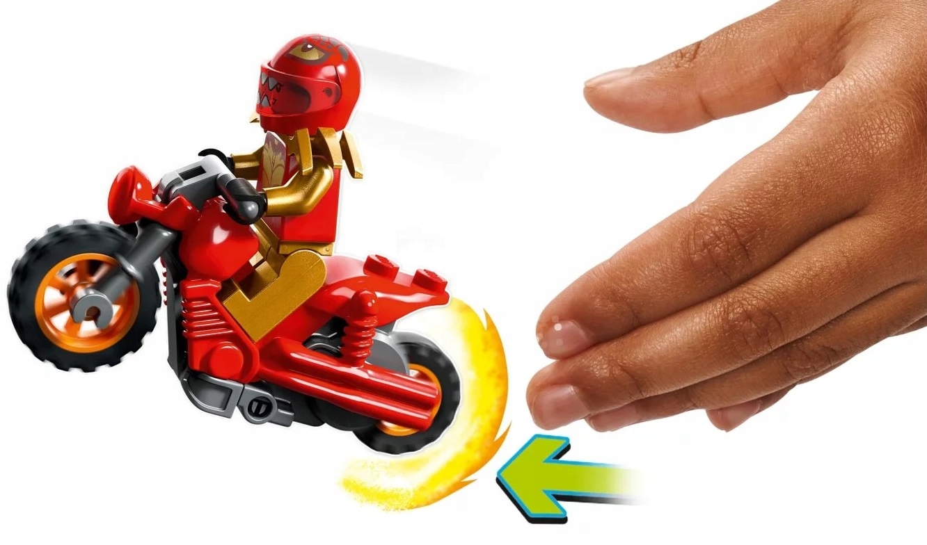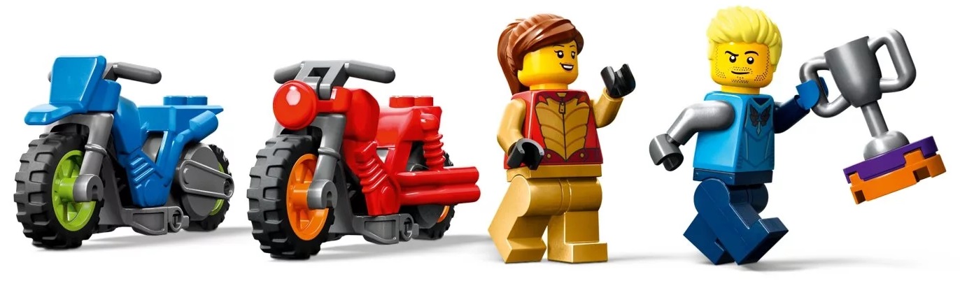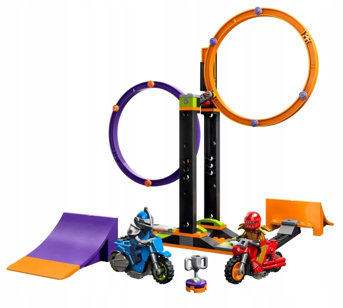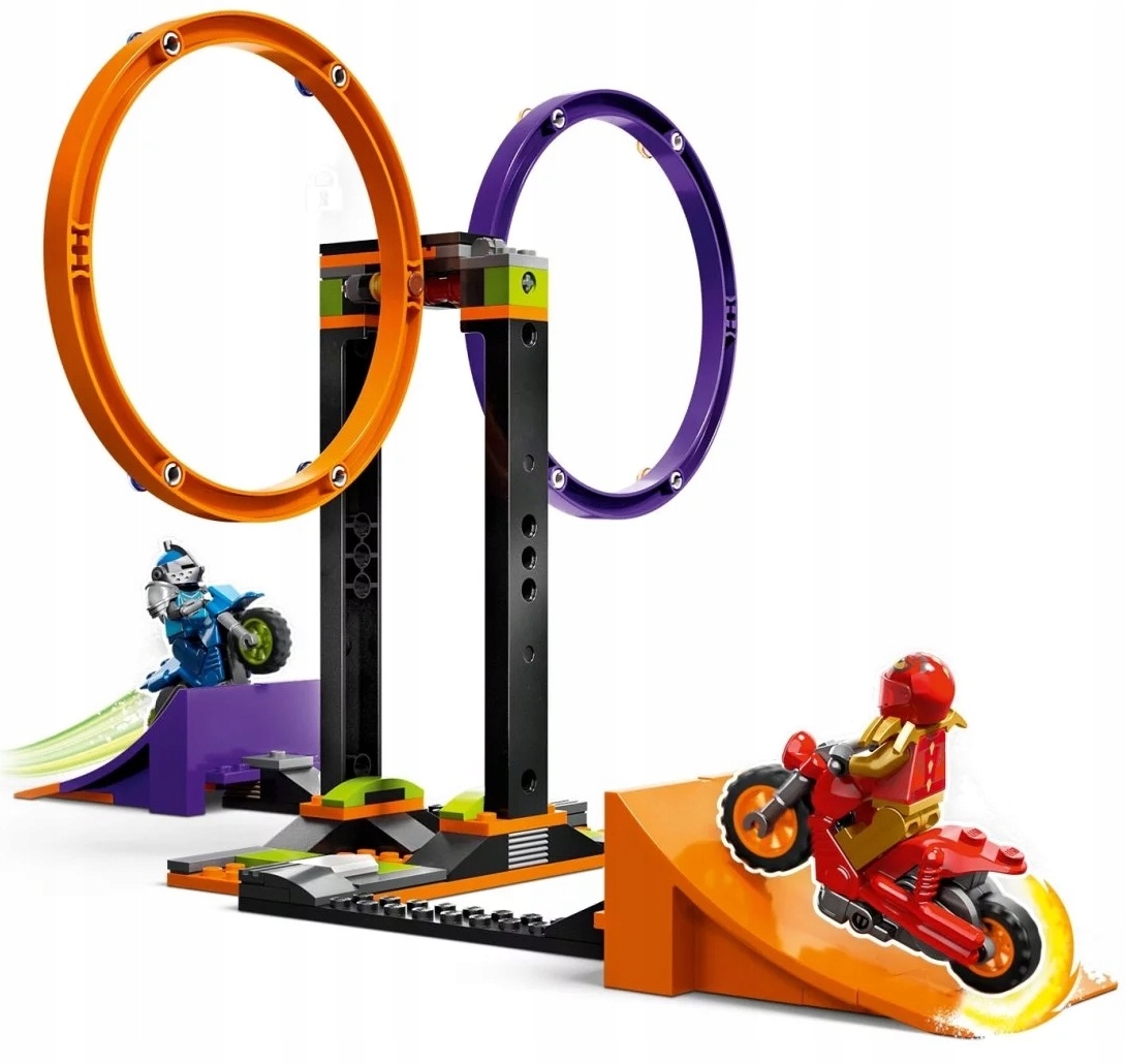 - Co jest w pudełku? – W zestawie jest podwójny pierścień kaskaderski, dwie rampy do skoków, dwa motocykle kaskaderskie napędzane kołem zamachowym i dwie minifigurki motocyklistów