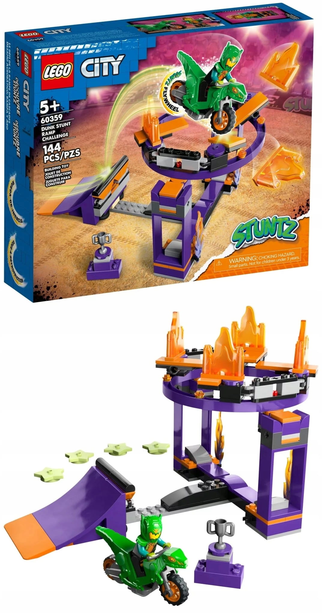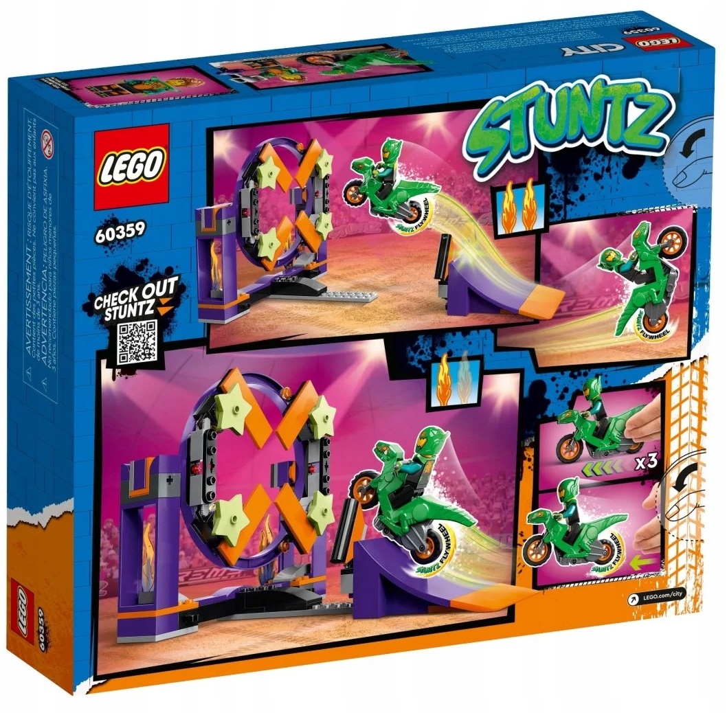 - Co jest w pudełku? – ten zestaw konstrukcyjny zawiera obręcz LEGO® City Stuntz do ustawienia w pionie lub poziomie, rampę startową, motocykl kaskaderski napędzany kołem zamachowym i minifigurkę motocyklisty