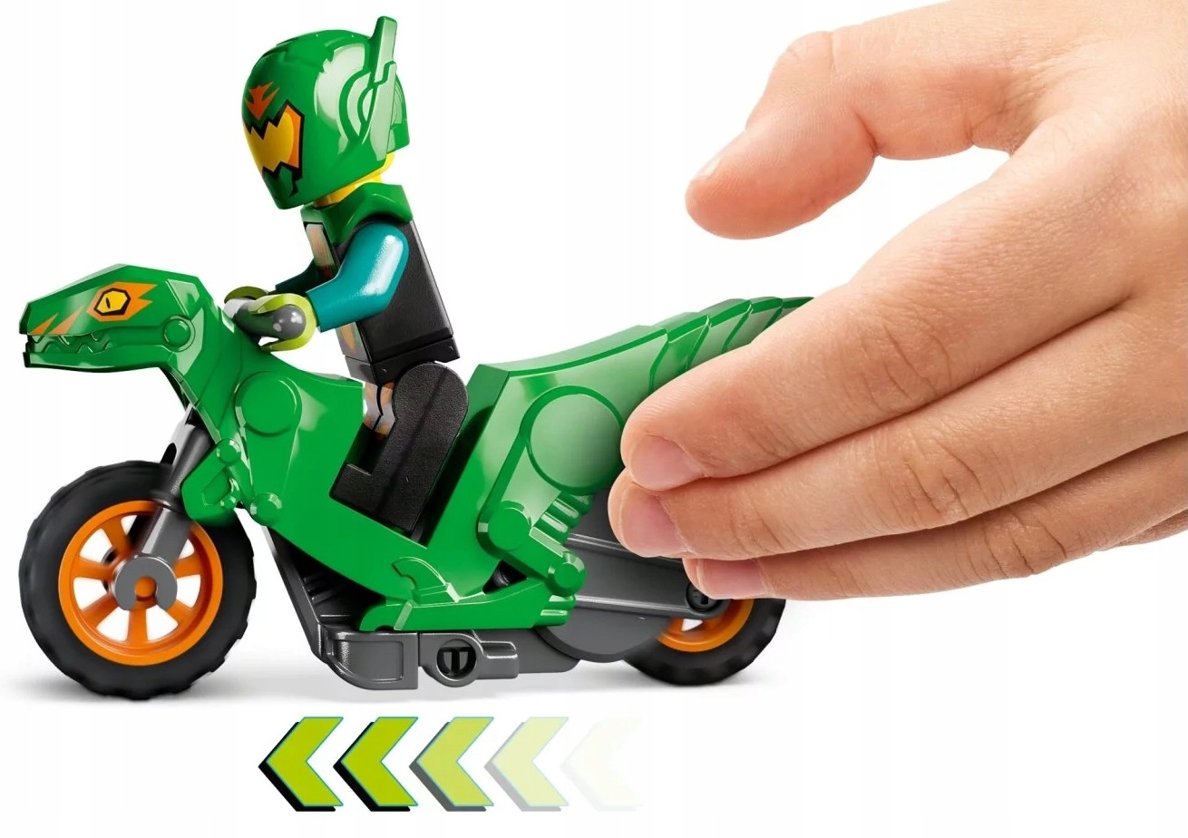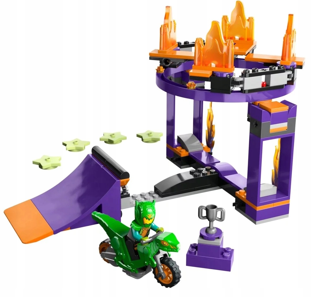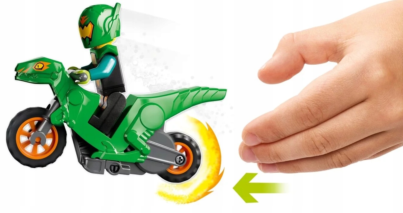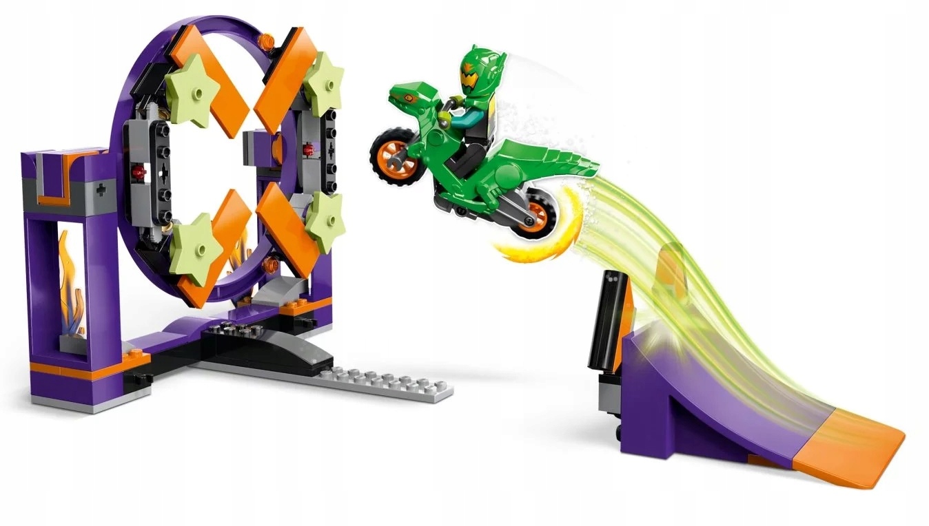 Dzieci ustawiają koło do skakania w pozycji pionowej lub poziomej, rozpędzają motocykl kaskaderski i wyskakują z rampy, aby wykonywać pełne akcji akrobacje. Zestaw zawiera motocyklistę LEGO City Stuntz.