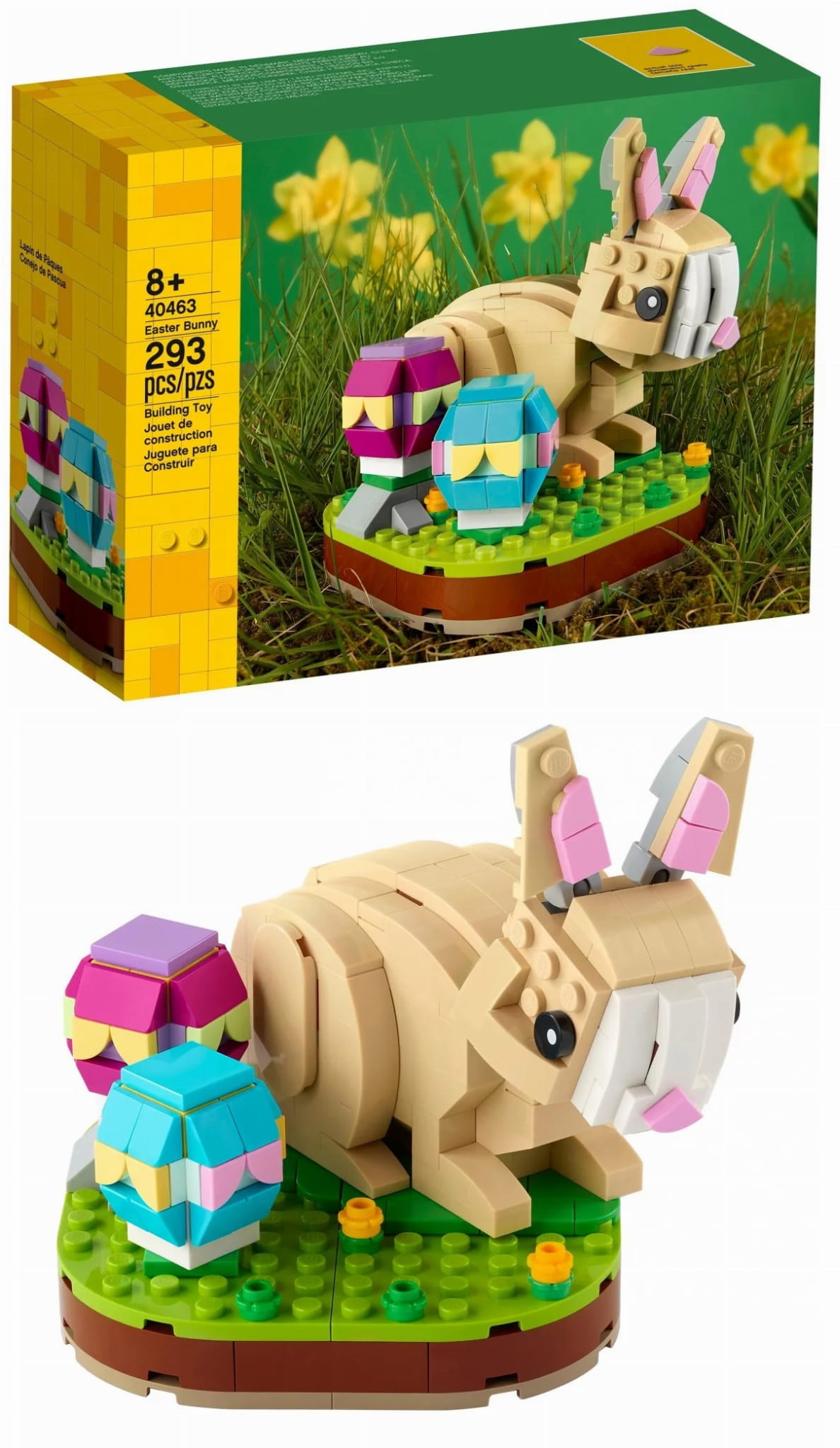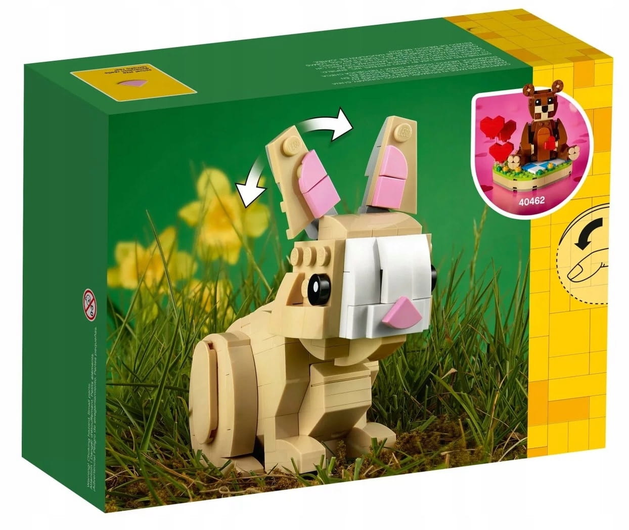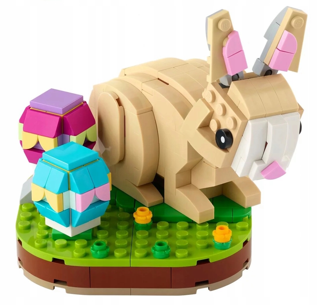 - Zajączek wielkanocny z zestawu LEGO® 40463 do zbudowania ma ruchomą głowę oraz uszy. Zestaw zawiera również łąkę i dwie pisanki, których wygląd można modyfikować.