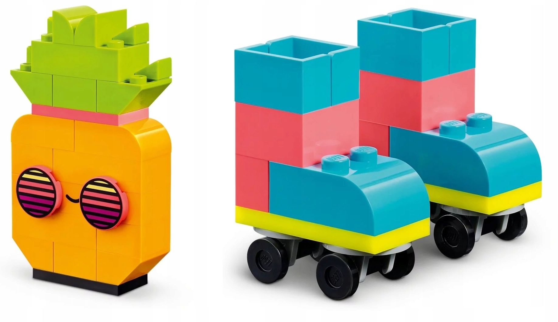 - Sugestie modeli – przejrzyste drukowane instrukcje budowania inspirują dzieci do stworzenia ananasa, zakreślacza, samochodu, kosmity i rolek