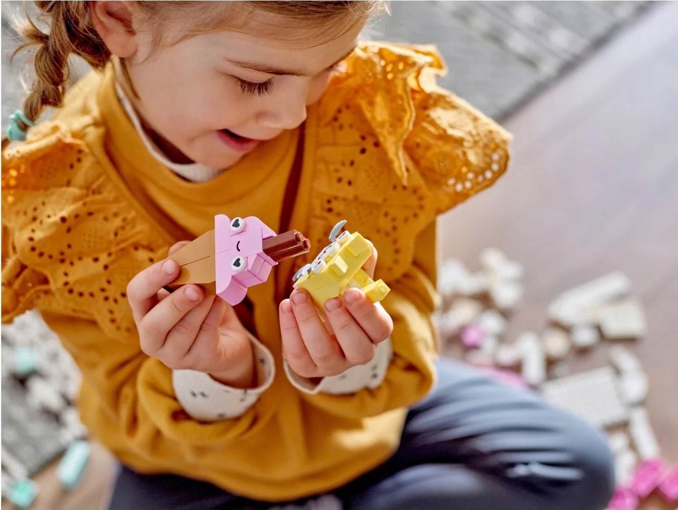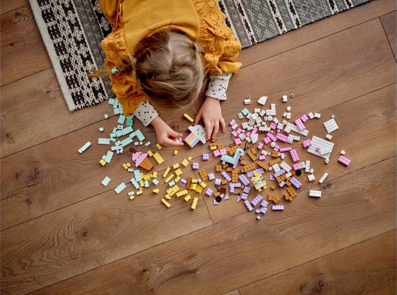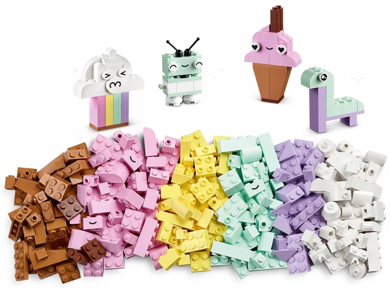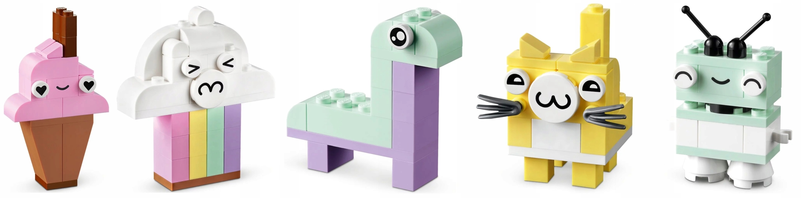 Ten kreatywny zestaw konstrukcyjny zawiera 333 klocki o różnych kształtach, rozmiarach i pastelowych kolorach. 18 klocków ma oczy, dzięki którym dzieci mogąożywić swoje dzieła. W zestawie są czytelne, drukowane instrukcje budowania dla pięciu łatwych do złożenia modeli: chmurki, lodów, dinozaura, kota i robota. Wraz ze wzrostem pewności siebie dzieci mogą odkrywać niekończącą się zabawę w budowanie.
