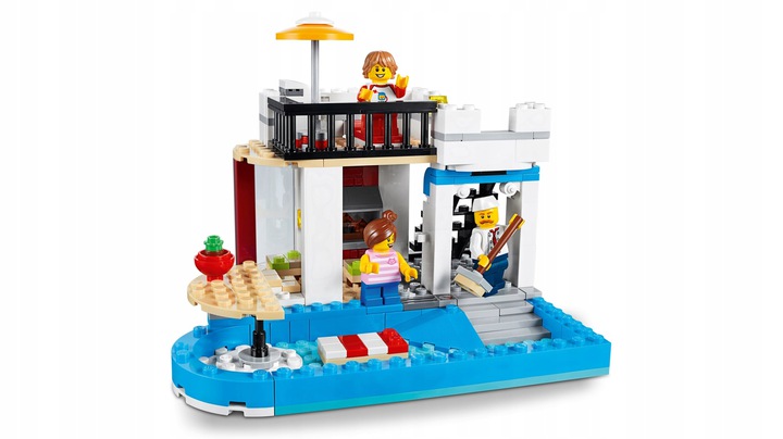 LEGO CREATOR 31077 Słodkie niespodzianki Serwuj smakołyki zadowolonym klientom przytulnej cukierni LEGO®. Budynek ma kolorową fasadę z trzema markizami w czerwone i białe paski, duże okno wykuszowe z obrotowym stojakiem na wypieki oraz schody prowadzące na taras na dachu z miejscami do siedzenia. Rewelacyjny zestaw modułowy LEGO Creator 3 w 1 31077 Słodkie niespodzianki zawiera także stoisko z przekąskami, parasol, bankomat i automat z gumą do żucia. Moduły do budowania LEGO Creator można łączyć w dowolny sposób i zmienić wygląd cukierni, zamieniając miejscami okna, drzwi i inne jej części. Ten model 3 w 1 można też przebudować na dom przy basenie lub kawiarnię na rogu, by zabawa była jeszcze dłuższa. Zestaw zawiera trzy minifigurki: sklepikarza i dwoje lojalnych klientów. W zestawie trzy minifigurki: sklepikarz i dwoje klientów. Cukiernia LEGO® do zbudowania ma kolorową fasadę, duże okno wykuszowe, obrotowy stojak na wypieki, trzy markizy w czerwone i białe paski, taras na dachu z miejscem do siedzenia, szyld z dekoracją w kształcie ciasta i rogalików oraz bankomat. W zestawie jest także stoisko z przekąskami, automat z gumą do żucia oraz dekoracyjne kwiaty i babeczki. Przygotuj przepyszne babeczki i wypieki, a potem ustaw je na wystawie w dużym oknie wykuszowym. Zaserwuj klientom smakołyki i napoje ze stoiska. Wejdź po schodach na dach i usiądź na tarasie. W łatwy sposób można zmienić wygląd cukierni, zamieniając miejscami okna, drzwi i inne modułowe części LEGO® Creator. Przeżywaj kolejne przygody z tym modelem 3 w 1. Cukiernię można przebudować na odprężający dom przy basenie lub przytulną kawiarnię na rogu.