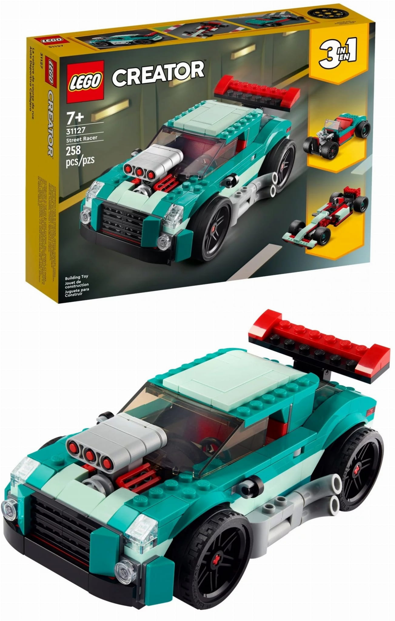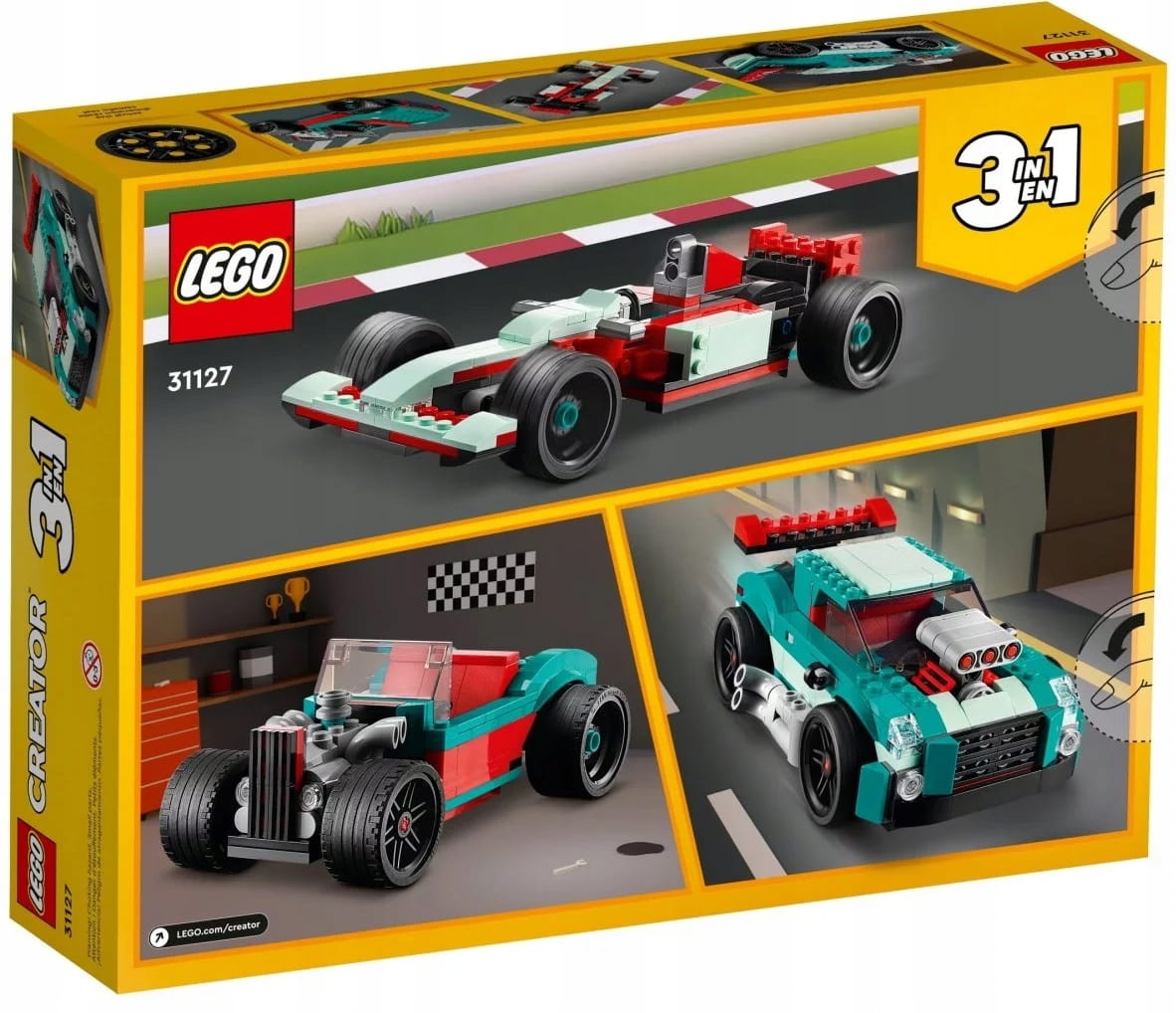 - Trzy zabawki w jednej — zestaw konstrukcyjny LEGO® Creator 3 w 1 Uliczna wyścigówka (31127) daje fanom samochodów nieograniczone możliwości zabawy w wyścigi dzięki trzem modelom do zbudowania: muscle carowi, samochodowi wyścigowemu i hot rodowi