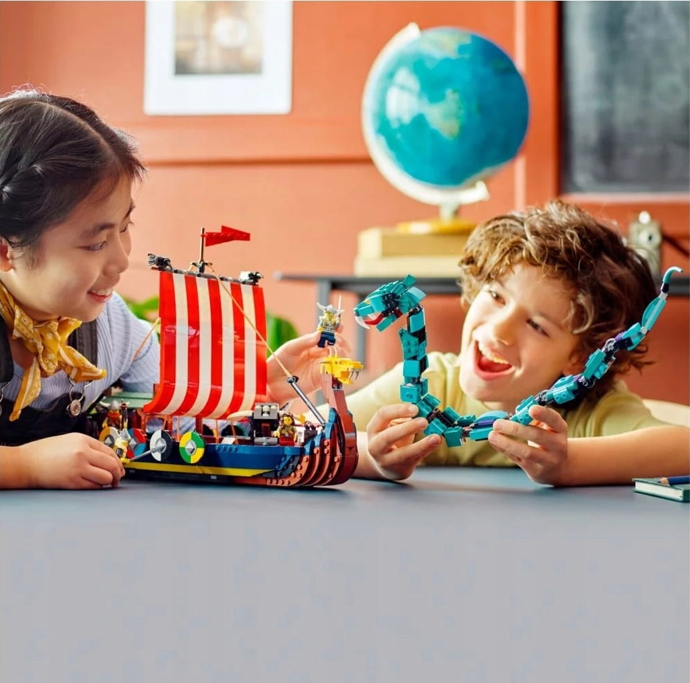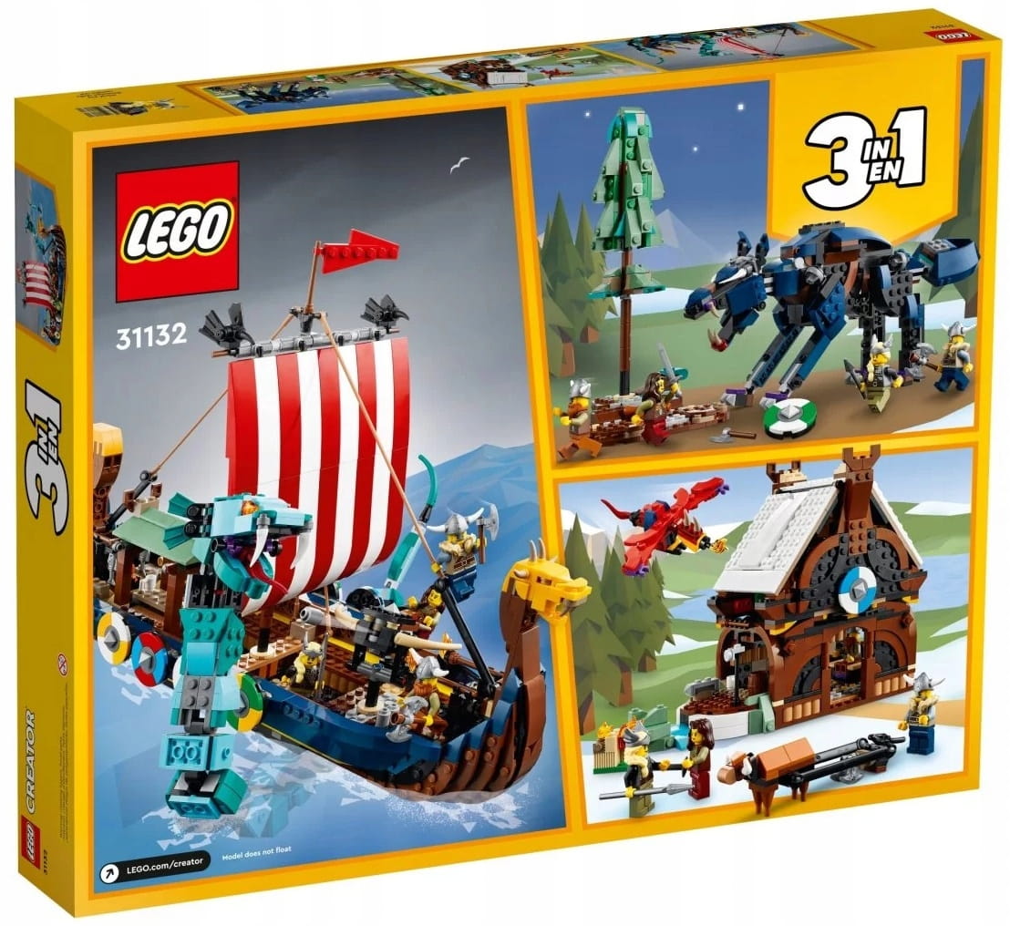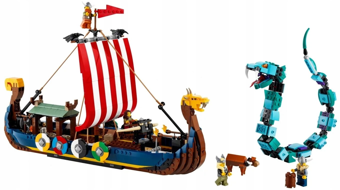 - Trzy zabawki w jednym zestawie z wikingami — zestaw LEGO® Creator 3 w 1 Statek wikingów i wąż z Midgardu (31132) zachwyci dzieci modelami statku, domu i wilka Fenrisa