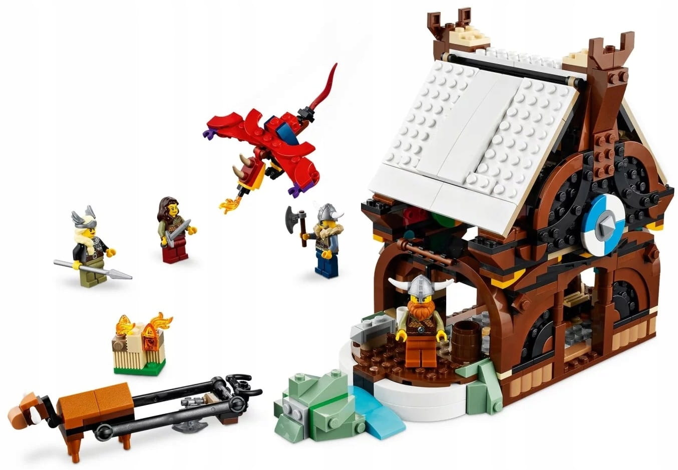 - Mnóstwo elementów — statek wikingów jest ozdobiony ośmioma tarczami, a na pokładzie znajdują się balista z miotaczem klocków, zbudowana z klocków krowa i dwa zbudowane z klocków kruki. Dom wikingów ma zaś zdejmowany dach