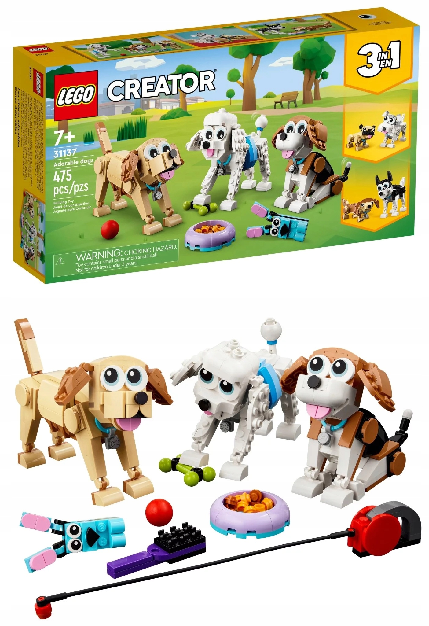 - Zestaw 3 w 1 – dzięki zestawowi LEGO® Creator 3 w 1 Urocze psiaki (31137) dzieci mogą stworzyć trzy różne grupy psów