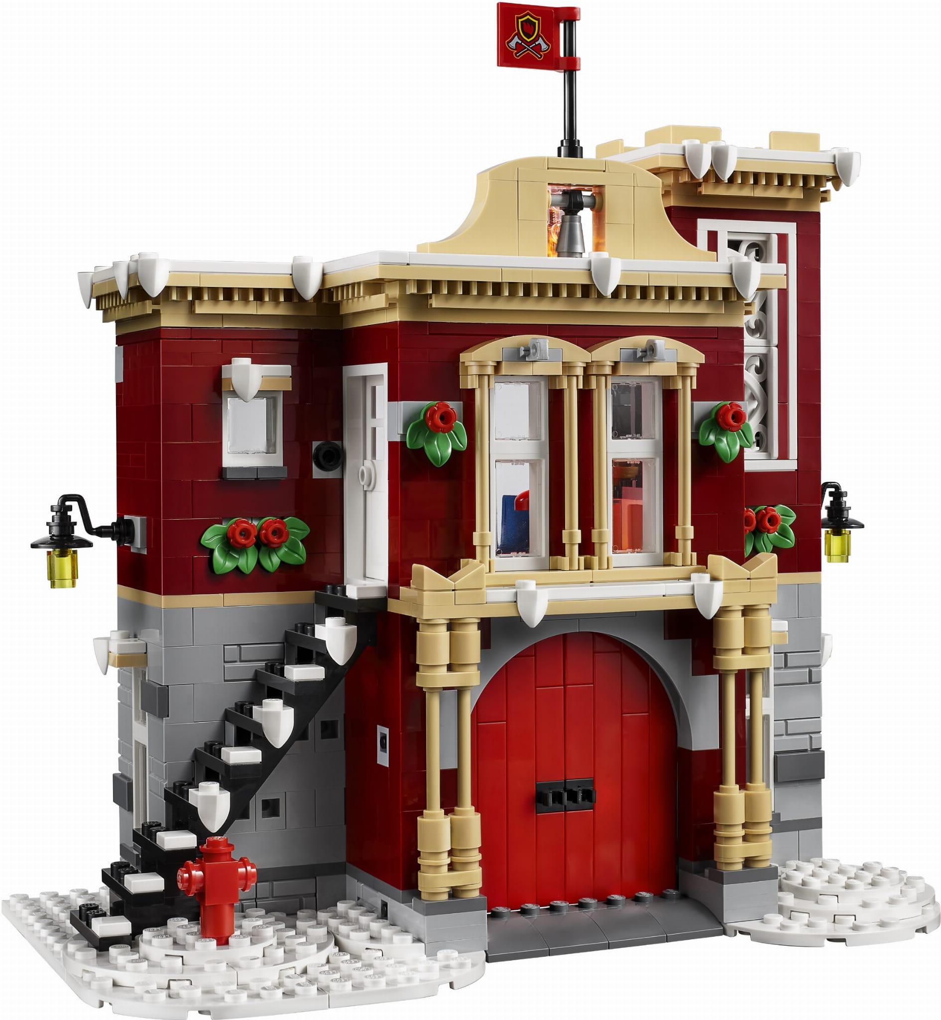 - piętrową remize strażacką w zimowej wiosce która pełna jest ciekawych szczegółów zbudowanych z klocków. Ma m.in. szczegółową fasadę z dekoracyjnymi kolumnami, ozdobne okna, duże, czerwone drzwi garażowe i dekoracje z ostrokrzewu. W zestawie jest też lodowisko z posągiem strażaka, ubrana choinka z przezroczystą gwiazdą na czubku, sanie, ławka, latarnia oraz świecący klocek LEGO®,