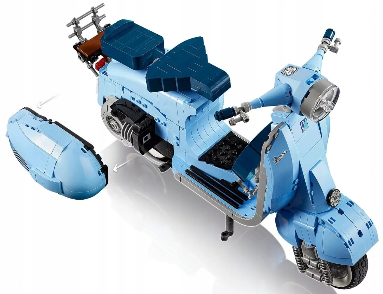 - Model inspirowany pierwowzorem — zbudowany z klocków skuter Vespa ma jednostronnie przymocowane przednie koło, dwa siedzenia, zdejmowaną osłonę silnika, ukryty pod nią silnik z klocków oraz działający układ kierowniczy