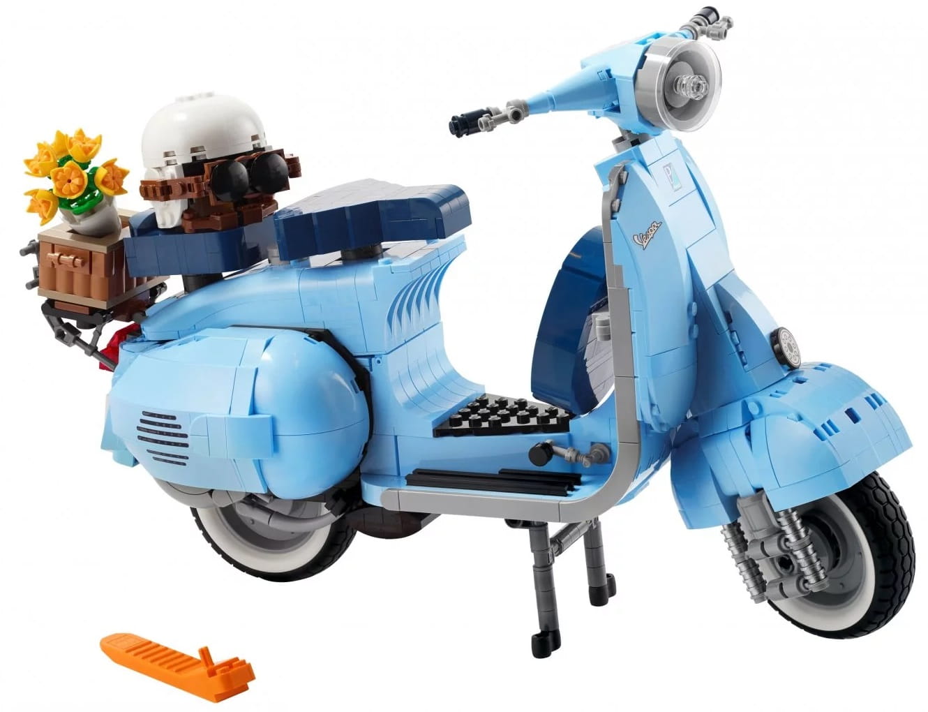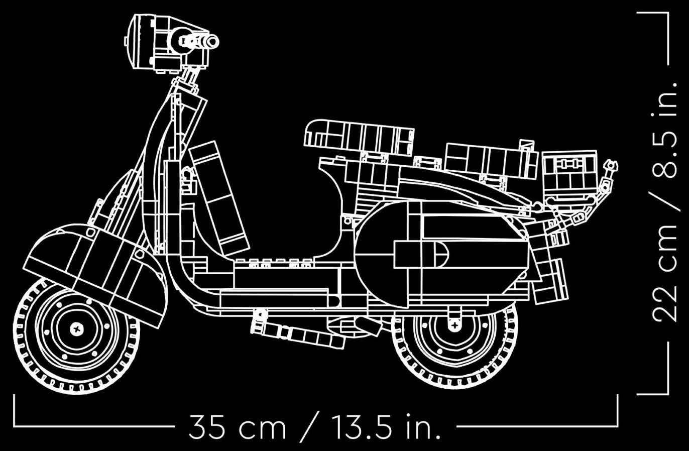 Model konstrukcyjny Vespy, tak jak jego pierwowzór, ma jednostronnie przymocowane przednie koło, dwa siedzenia, zdejmowaną osłonę silnika, pod którą kryje się silnik z klocków, działającą podpórkę oraz działający układ kierowniczy. Wśród wieńczących model detali znajdują się logo Vespy, klasyczna włoska tablica rejestracyjna z lat 60., koło zapasowe, kask i zamocowany z tyłu kosz na akcesoria z bukietem kwiatów.