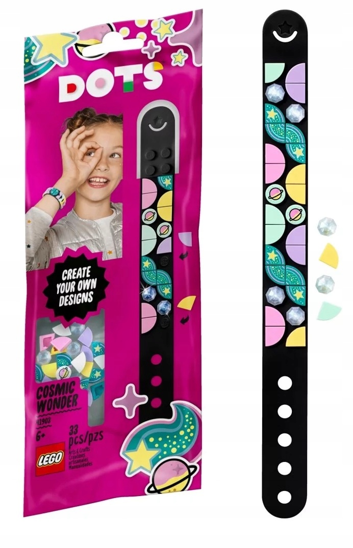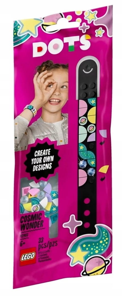 - Zachęć dzieci do kreatywnych prac ręcznych uroczym zestawem LEGO® DOTS™ Bransoletka z cudami kosmosu (41903), który zawiera regulowaną bransoletkę i 32 kolorowe płytki. Zabawa zaczyna się od dekorowania — wystarczy wysypać klocki!