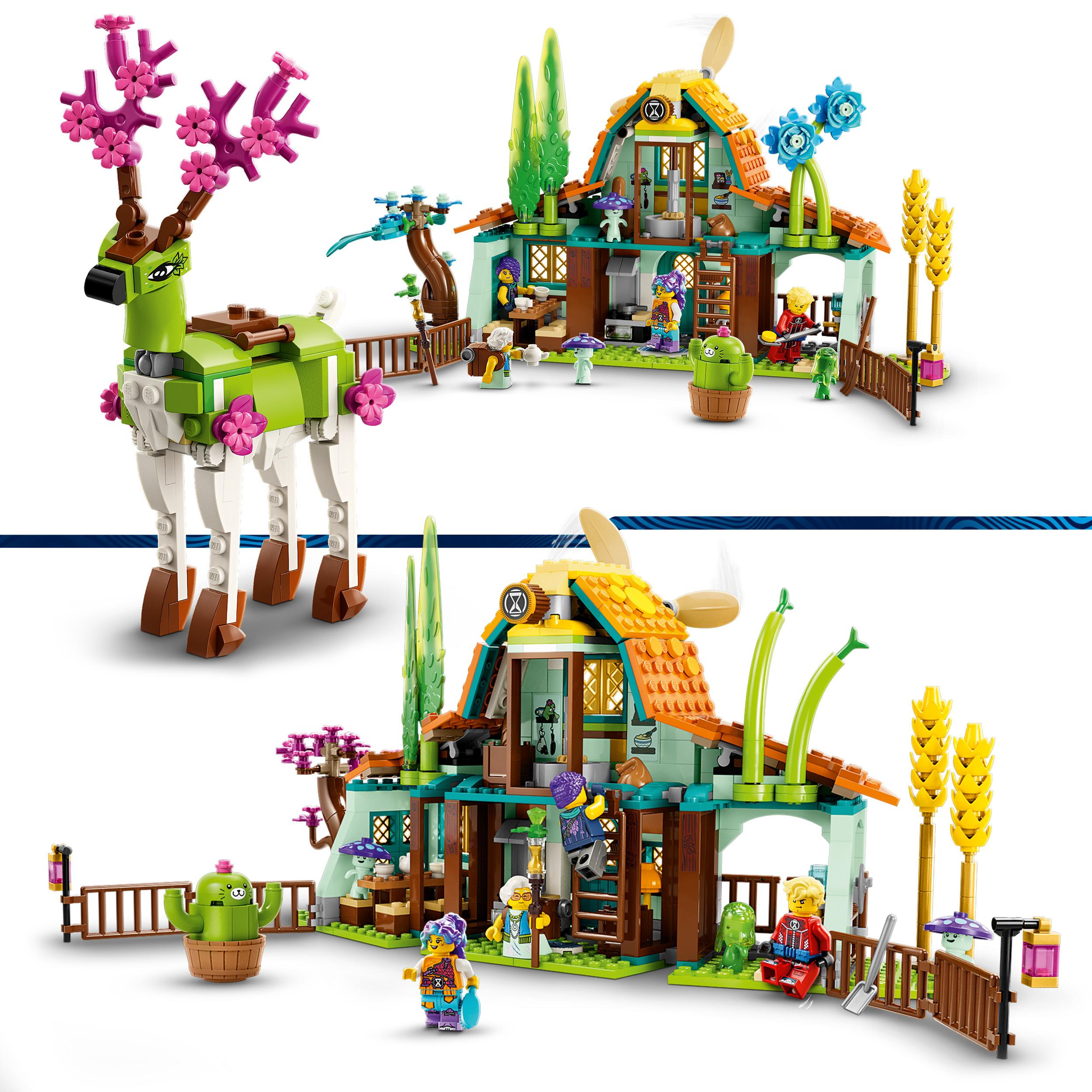 Stajnia fantastycznych stworzeń dla dzieci w wieku od ośmiu lat dzieci mogą poznać mityczne stworzenia i cieszyć się budowaniem dwóch różnych modeli. Fajny zestaw inspirowany serialem "LEGODREAMZzz" Dzięki temu zestawowi LEGO DREAMZzz opartemu na serialu telewizyjnym dzieci w wieku od ośmiu lat mogą odkryć niesamowitą Stajnię fantastycznych stworzeń (71459). Zestaw jest pełen inspirowanych naturą detali, a także nowych przyjaciół. Pozwala dzieciom poznawać mityczne stworzenia i pielęgnować magiczne kwiaty. Niesamowite szczegóły rozwijają dziecięcą wyobraźnię. Dzieci będą zachwycone, odkrywając działanie wiatraka, zwiedzając stodołę (z otwieranymi oknami i bramami) oraz poznając nowych, mitycznych przyjaciół, na przykład dwóch snoludków. Jeden zestaw do zbudowania na dwa sposoby Zestaw umożliwia zbudowanie modelu w dwóch wersjach. Dzieci mogą ozdobić jelenia jako latającego pegaza lub pięknego strażnika lasu. Oprócz rozwijania kreatywności zestaw sprawi, że zabawa będzie jeszcze dłuższa. Fantastyczne detale Jeleń ma ruchomą głowę i nogi, co ułatwia ustawianie go w pozach i zabawę. Poroże można zamienić na kwiaty ze stajni. Pełne szczegółów minifigurki to Izzie, Zoey, Cooper i pani Castillo. Poznaj mityczne stworzenia i hoduj magiczne kwiaty w Stajni fantastycznych stworzeń! W tym urokliwym miejscu możesz zaopiekować się kwiatowym jeleniem, doglądać kociego kaktusa i pielęgnować wymarzone kwiaty. Pomóż Cooperowi nakarmić kaktusa, siekając pszenicę i mieląc ją na ziarno, a także pomóż Izzie wyśnić latającego jelenia-pegaza w dwóch różnych odsłonach.
