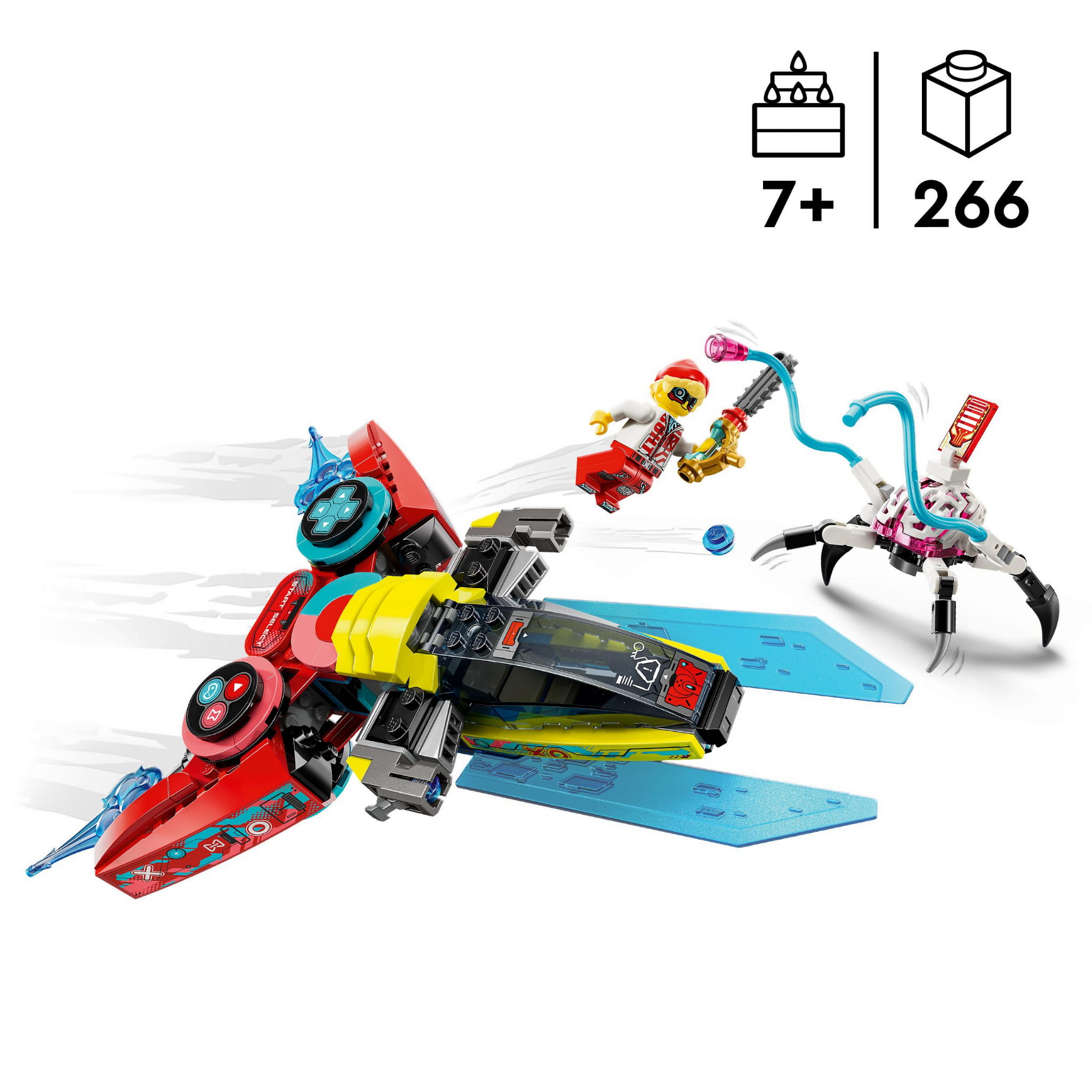 - Wymiary — zestaw zawiera 266 elementów, a w trybie gamingowego ścigacza ma 4 cm wysokości, 22 cm długości i 18 cm szerokości.