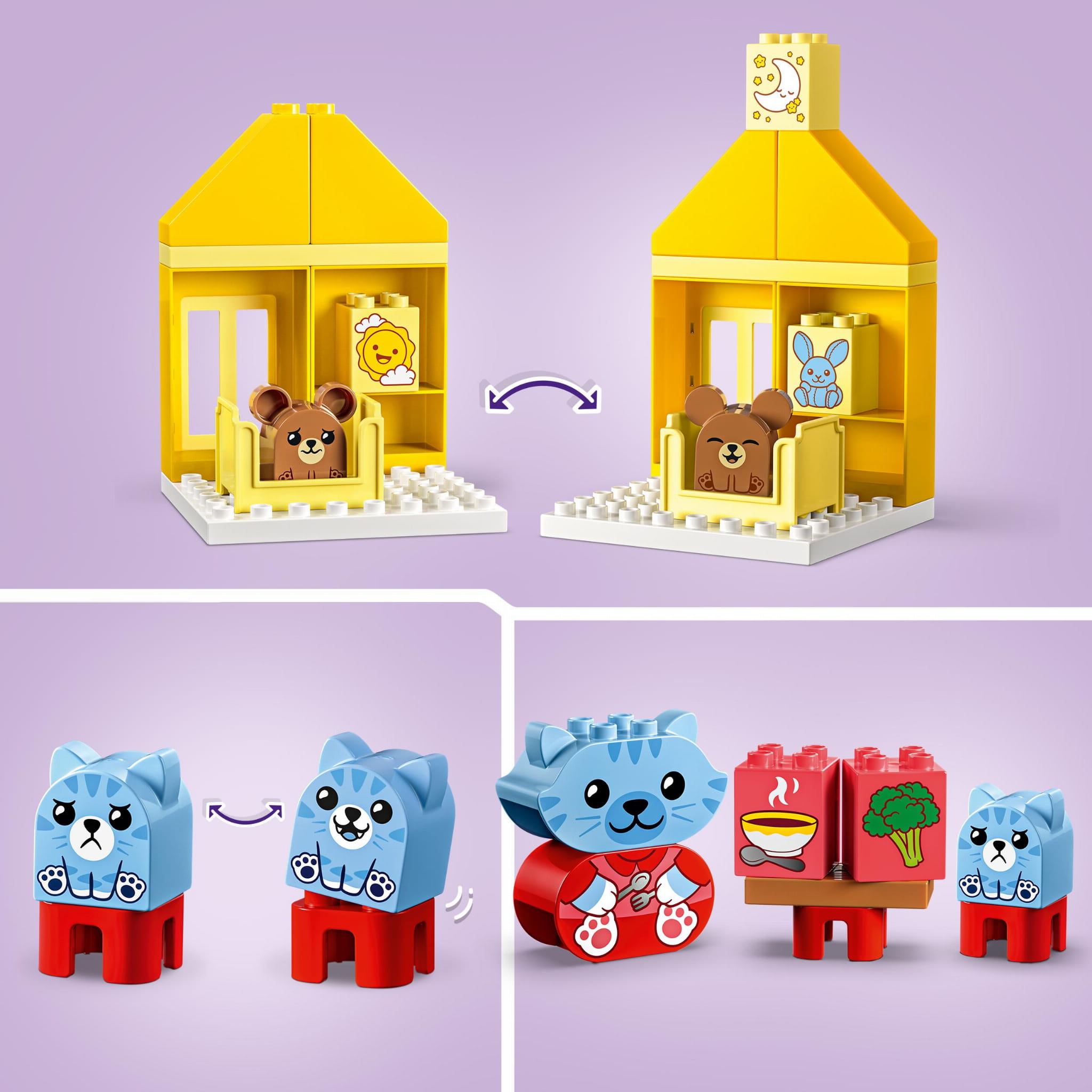 Pomóż dzieciom wyrazić emocje poprzez zestaw LEGO® DUPLO® Moje pierwsze codzienne czynności — jedzenie i pora snu (10414).