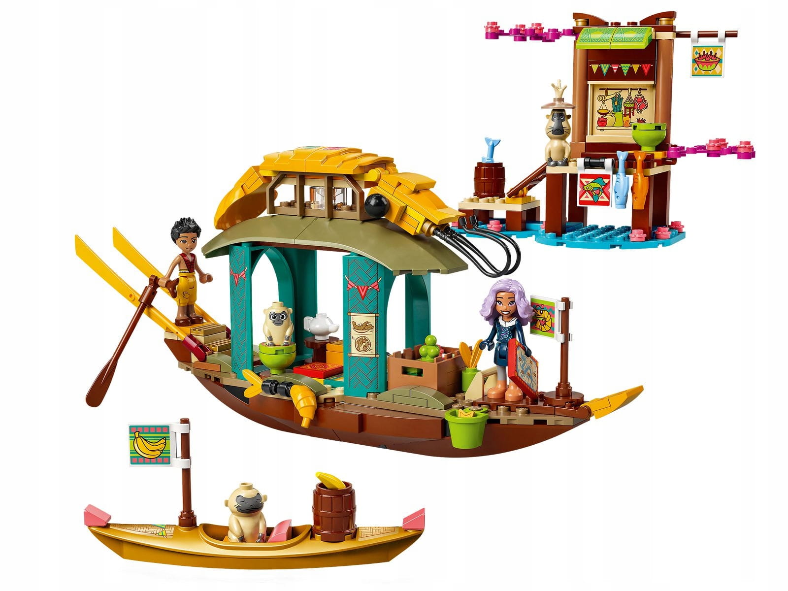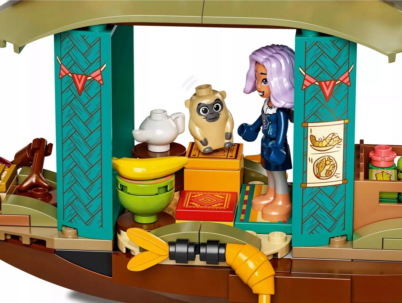 - Zestaw inspirowany nowym filmem Disneya „Raya i ostatni smok” zawiera łódź z dekoracją w kształcie krewetki, mniejszą łódkę i dok, trzy figurki LEGO® Ongi oraz minilaleczki: Sisu w ludzkiej postaci i Bouna.