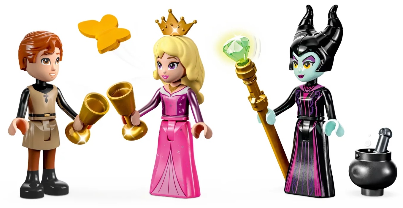 - Szybka budowa – zestaw zawiera model zamku, minilaleczki LEGO® Aurory, księcia Filipa i Diaboliny Disneya oraz dwa mniejsze modele. Każda torebka z klockami zawiera figurkę do rozpoczęcia zabawy