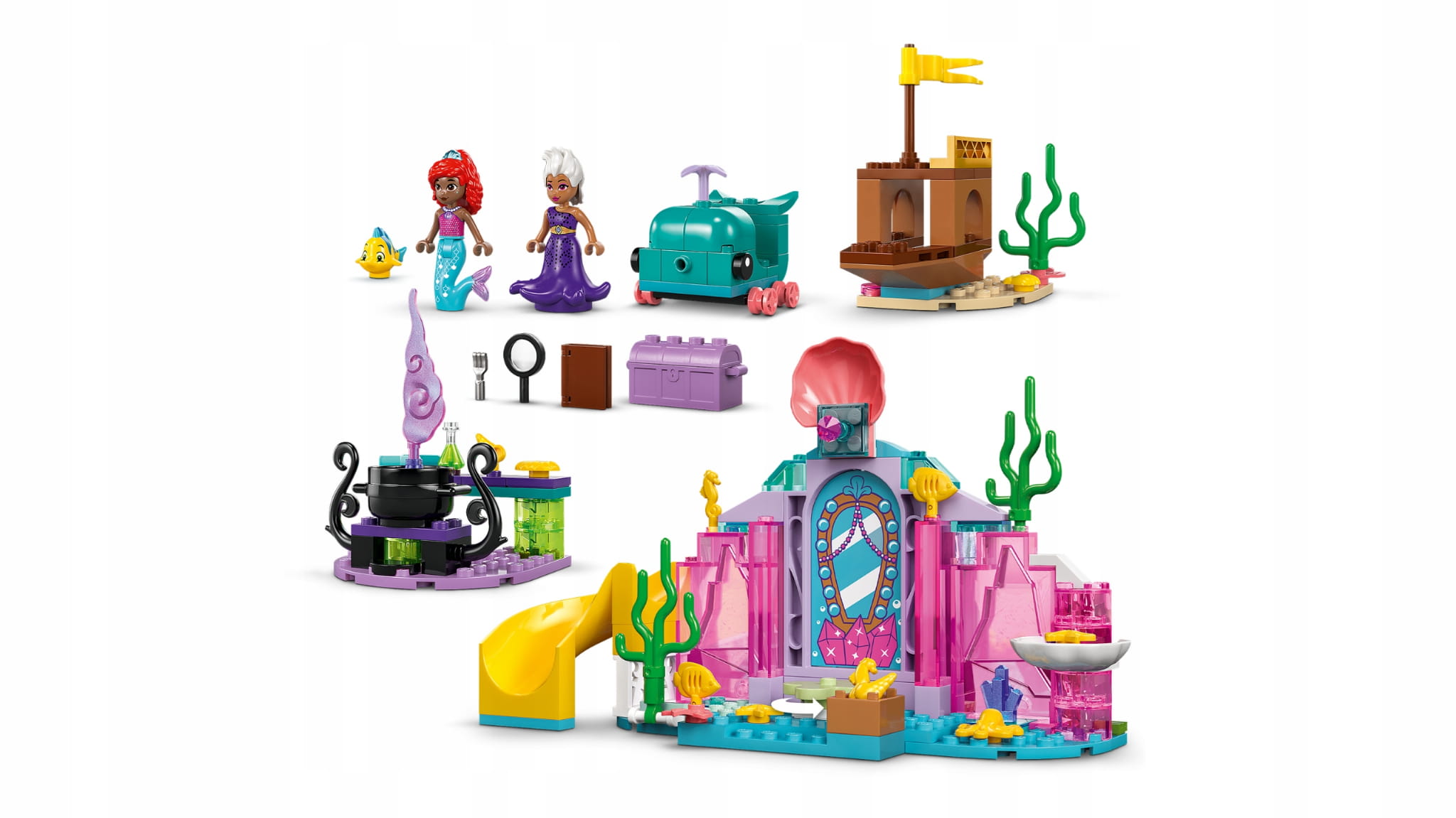 - Zestaw konstrukcyjny — ta zabawka zawiera pojazd w kształcie wieloryba, wrak statku z ukrytą skrzynią ze skarbami oraz sekcję z magicznymi miksturami ze stołem, kociołkiem i eliksirami Urszuli
