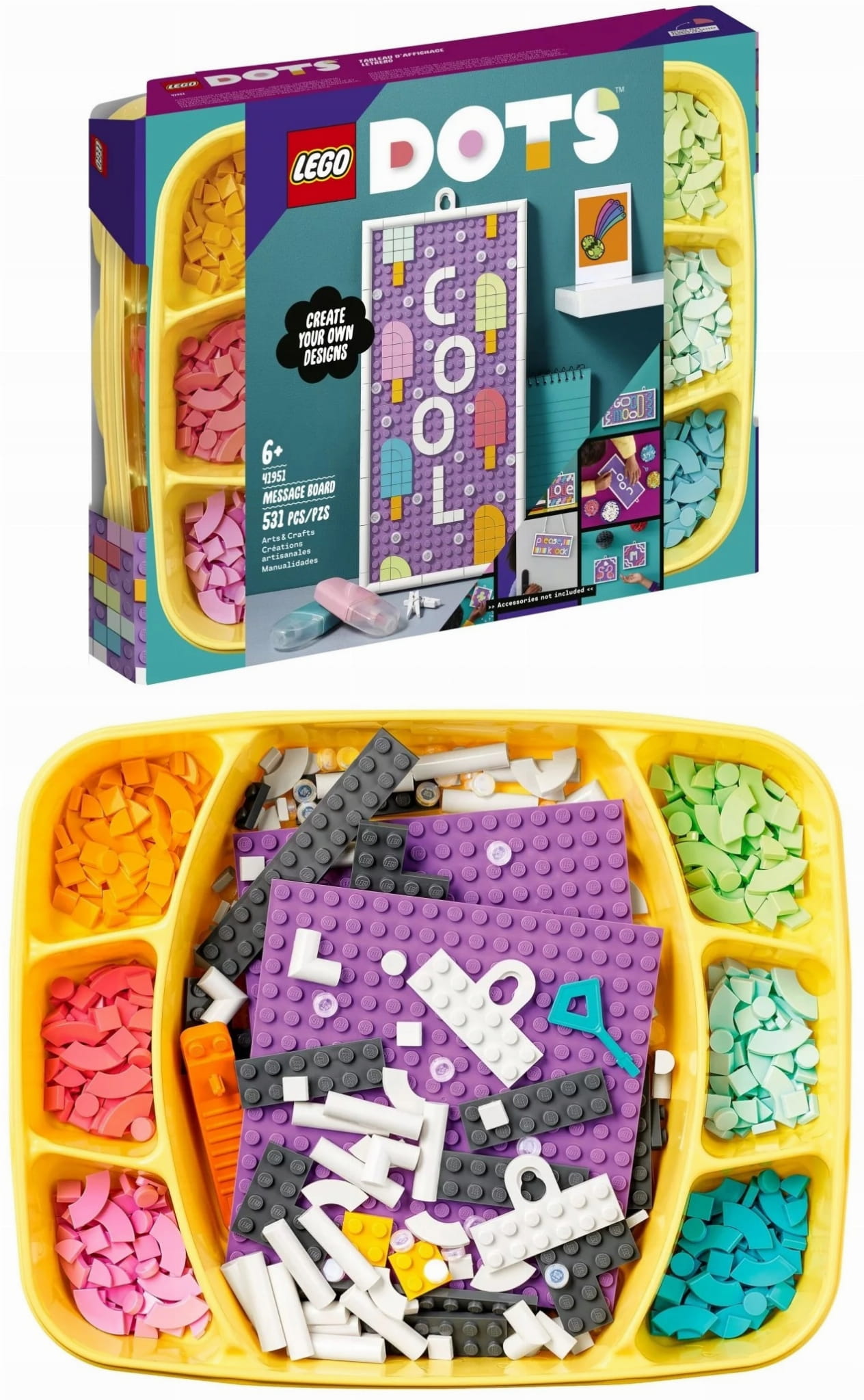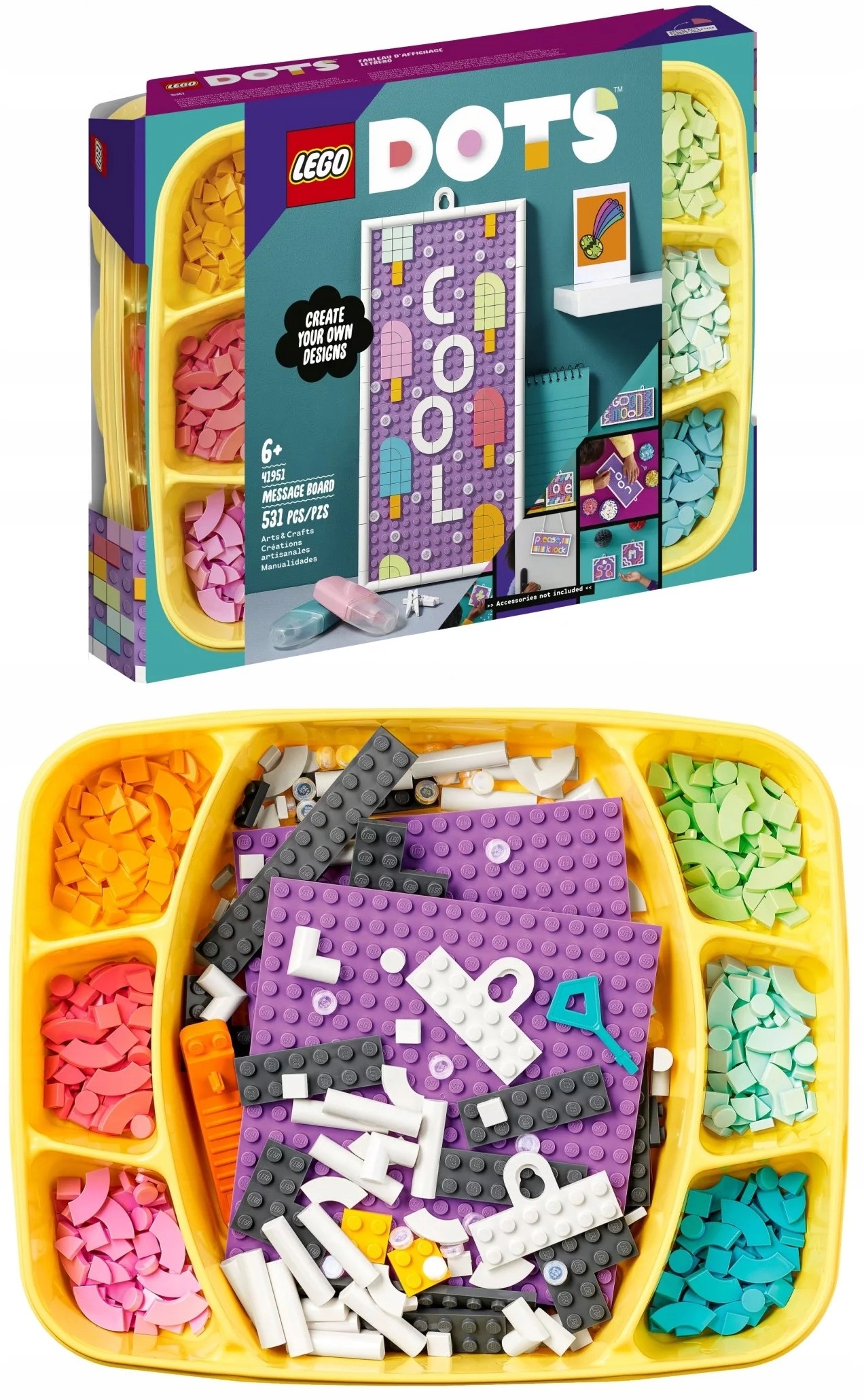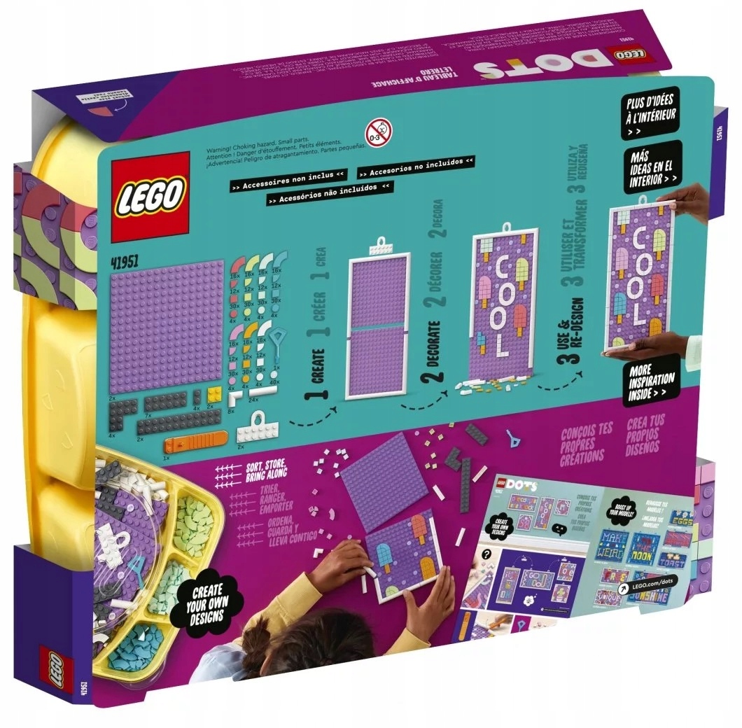 - Pokaż swoją indywidualność — z zestawem LEGO® DOTS Tablica ogłoszeń (41951) miłośnicy rękodzieła mogą rozwijać swoje pasje. Kreatywna zabawa zaczyna się od razu po otworzeniu tacki