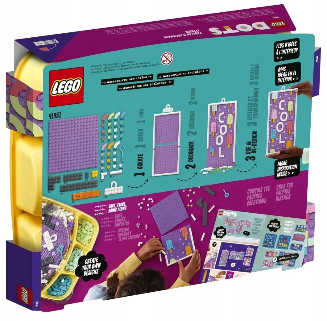 - Wolność i pewność siebie — to pudełko LEGO® DOTS to esencja nieograniczonej kreatywności. Zabawa płytkami i tablicą pobudza wyobraźnię dzieci i rozwija ich pomysłowość oraz wytrwałość