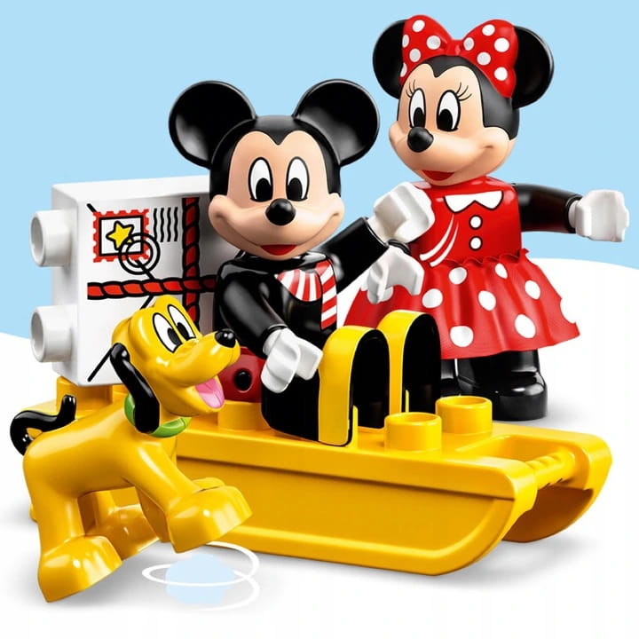 Ta edukacyjna zabawka konstrukcyjna Disneya z Myszką Miki i Myszką Minnie zawiera sanie, na których bohaterowie mogą jeździć.