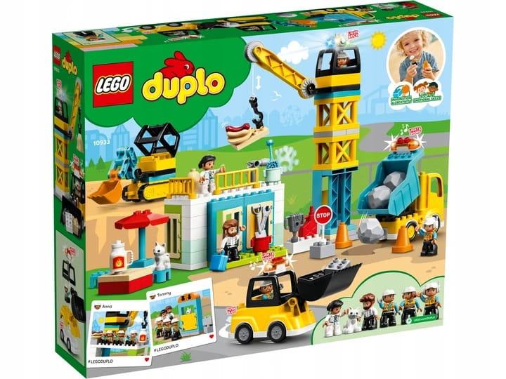 LEGO DUPLO Construction Żuraw wieżowy i budowa (10933) to zestaw z całym mnóstwem pojazdów, postaci i zadań do wykonania, które zainspirują przedszkolaki do wymyślania historii i pomogą im się rozwijać. Ruchliwy zabawkowy plac budowy z mnóstwem możliwości Odkrywanie wszystkich możliwości kipiącego życiem placu budowy dostarczy małym budowniczym rozrywki na cały dzień. Rodzice i maluchy mogą wspólnie bawić się w wożenie materiałów, budowanie wieży oraz sprzątanie gruzu z ulicy - pomoże im w tym duży i mały buldożer, wywrotka, koparka i dźwig. W zestawie jest nawet stragan z hot dogami, by podczas przerwy obiadowej żaden robotnik nie pozostał głodny! Zróżnicowany zestaw z wieloma funkcjami W pudełku dzieci znajdą pięć nowoczesnych postaci: pracowniczkę-malarkę, operatorkę dźwigu, dwóch robotników i sprzedawcę hot dogów. Jest tam też wiele ciekawych dodatków, takich jak klocki ze światłem i dźwiękiem czy silnik z funkcją ręcznego startu w buldożerze, więc zabawa tym zestawem będzie dla każdego przedszkolaka wciągającym doświadczeniem. Zabawkę można też połączyć z innymi zestawami LEGO DUPLO Construction, więc dawka frajdy może być podwójna.
