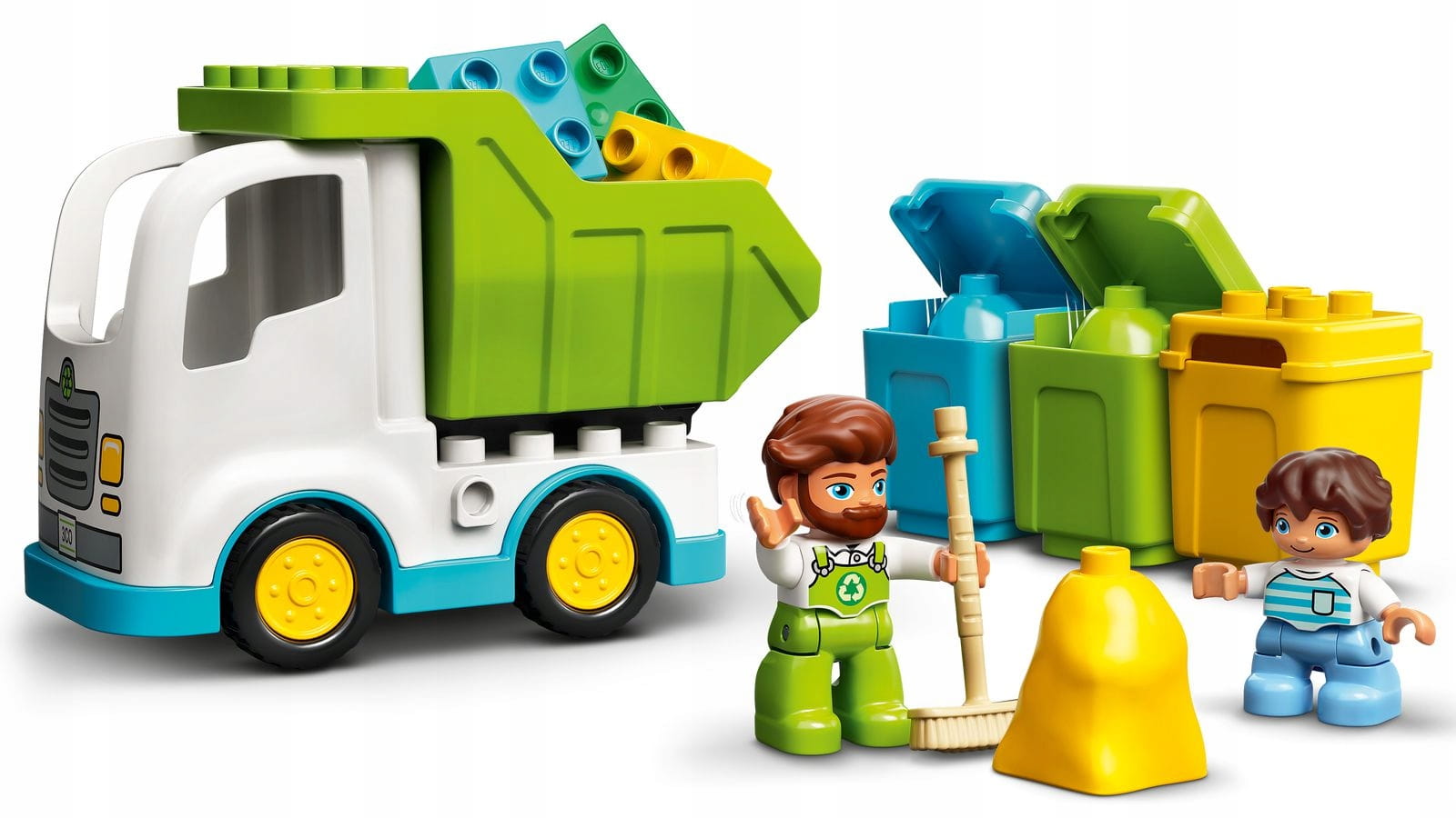 - Zawiera dwie figurki DUPLO® — mężczyznę i chłopca segregujących śmieci — oraz ruchomą śmieciarkę z przechylaną skrzynią ładunkową, trzy worki pasujące do trzech koszów na śmieci i dużą miotłę.