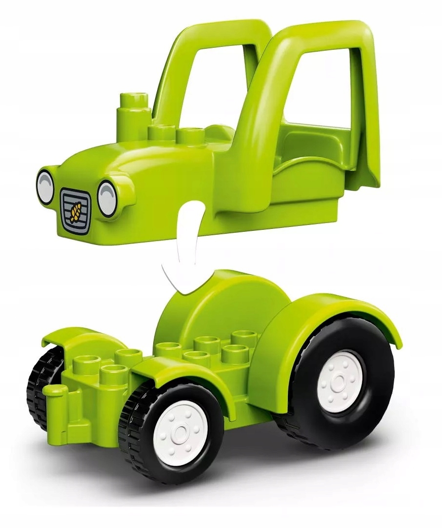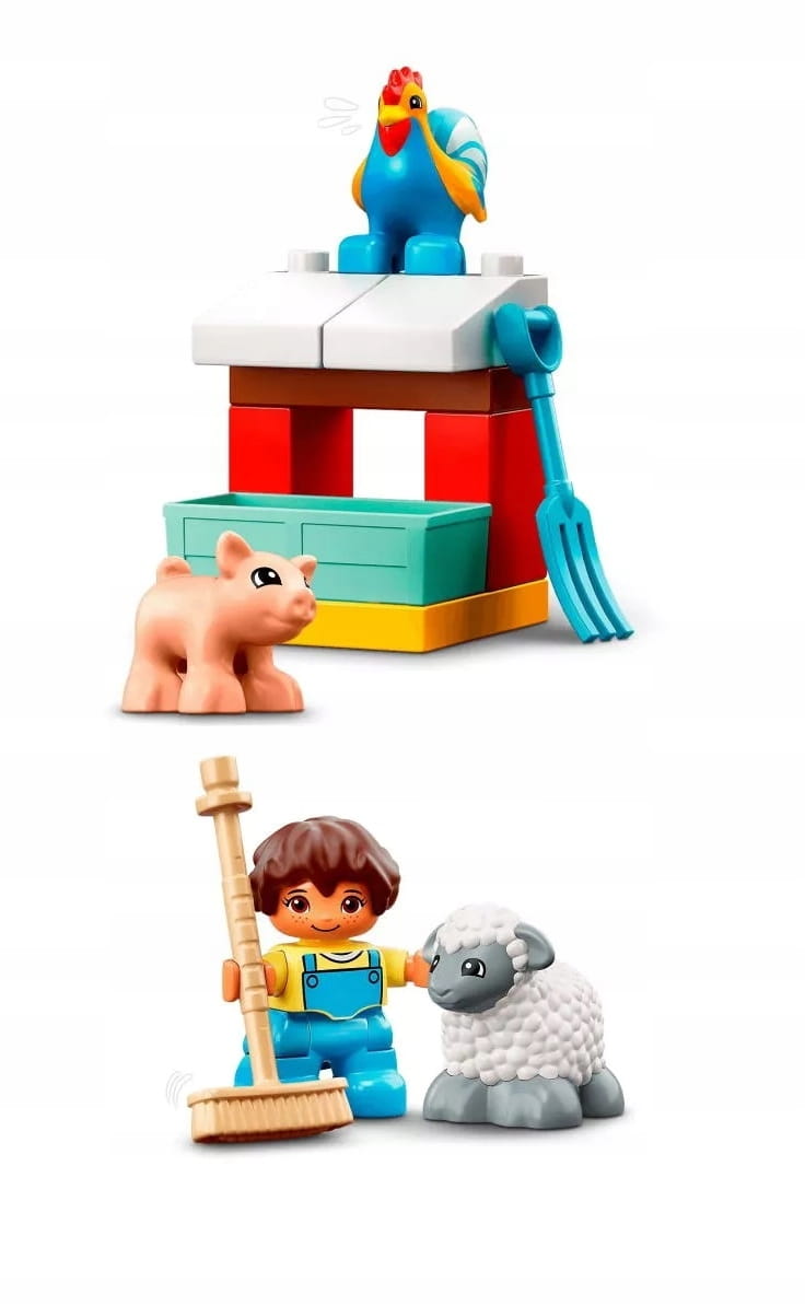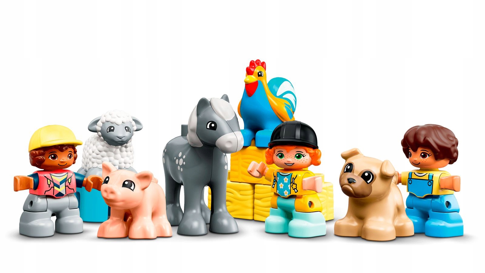 - W zestawie traktor, świnka, owca, koń, pies, kura, kogut i dwie krowy, a do tego cztery figurki LEGO® DUPLO®, stodoła do zbudowania, bela siana o realistycznej teksturze oraz wiele ciekawych akcesoriów.