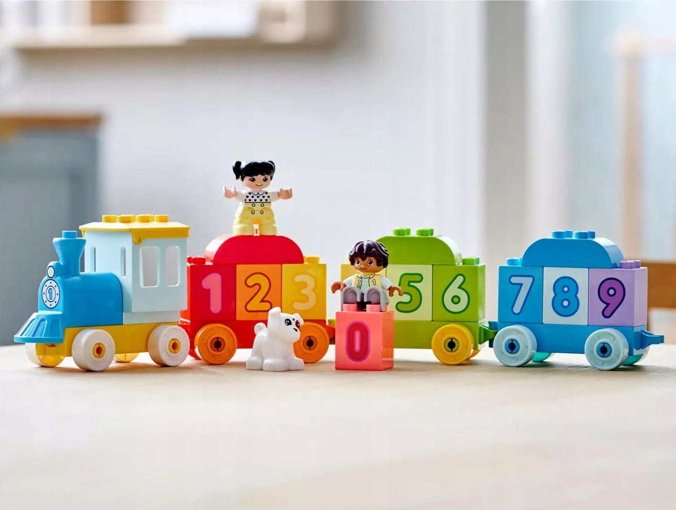 - W komplecie popychany pociąg z wagonami wypełnionymi 10 klockami z cyframi, a do tego figurki LEGO® DUPLO® chłopca, dziewczynki i pieska, które inspirują do twórczego odgrywania ról.
