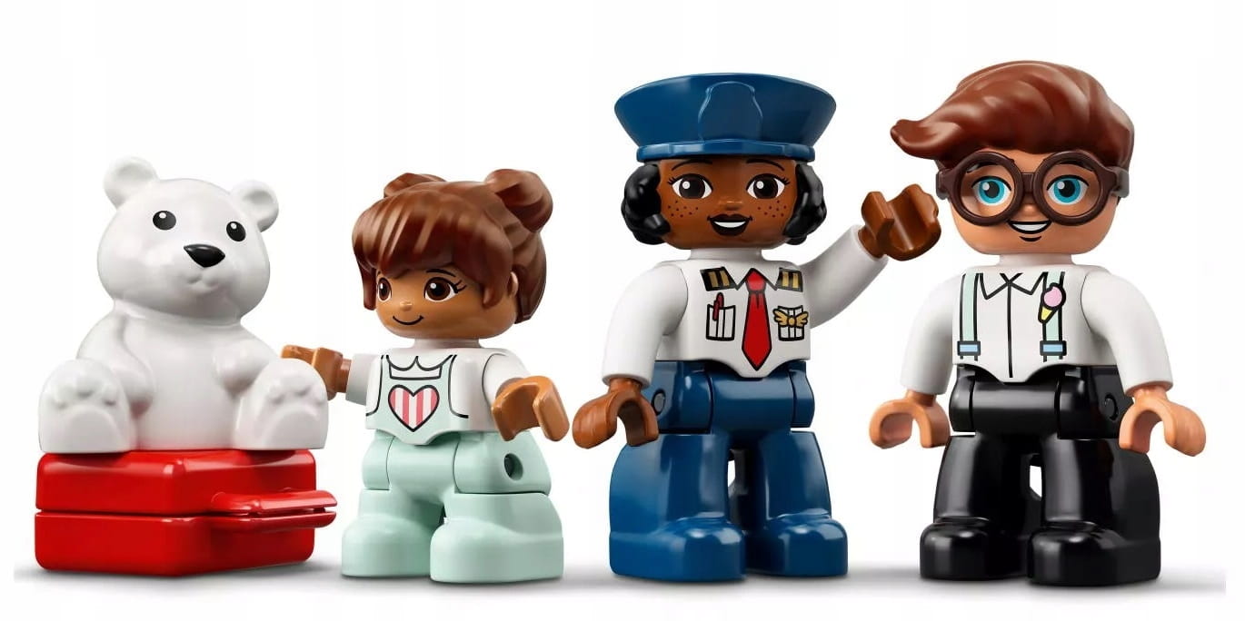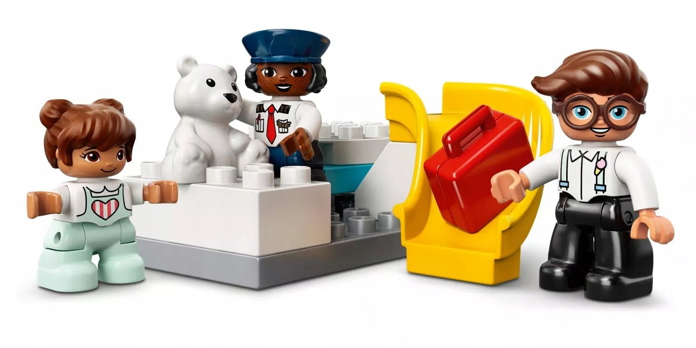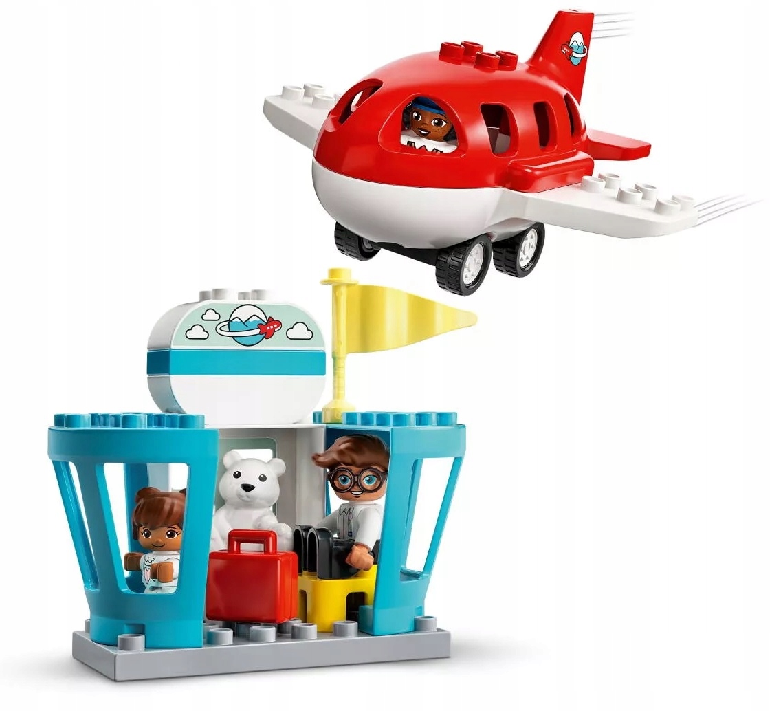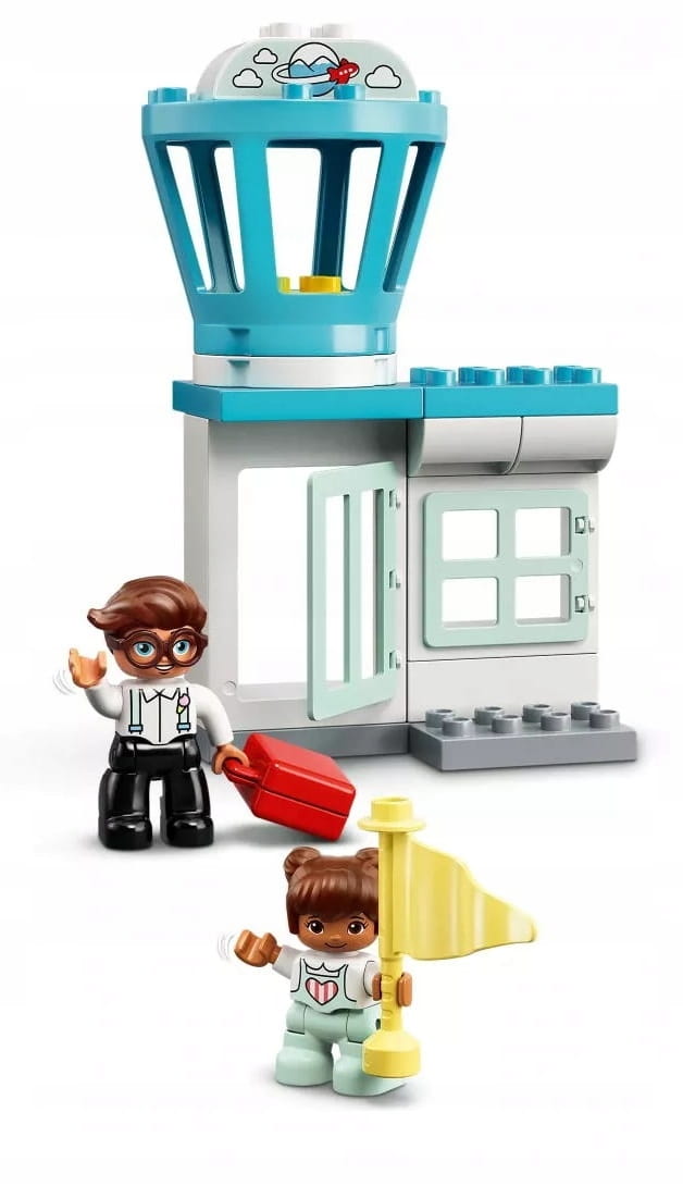 - W komplecie trzy figurki DUPLO® — tata, dziewczynka i pilot — a także samolot ze zdejmowanym dachem, obracana wieża kontroli lotów oraz zjeżdżalnia dla bagaży.