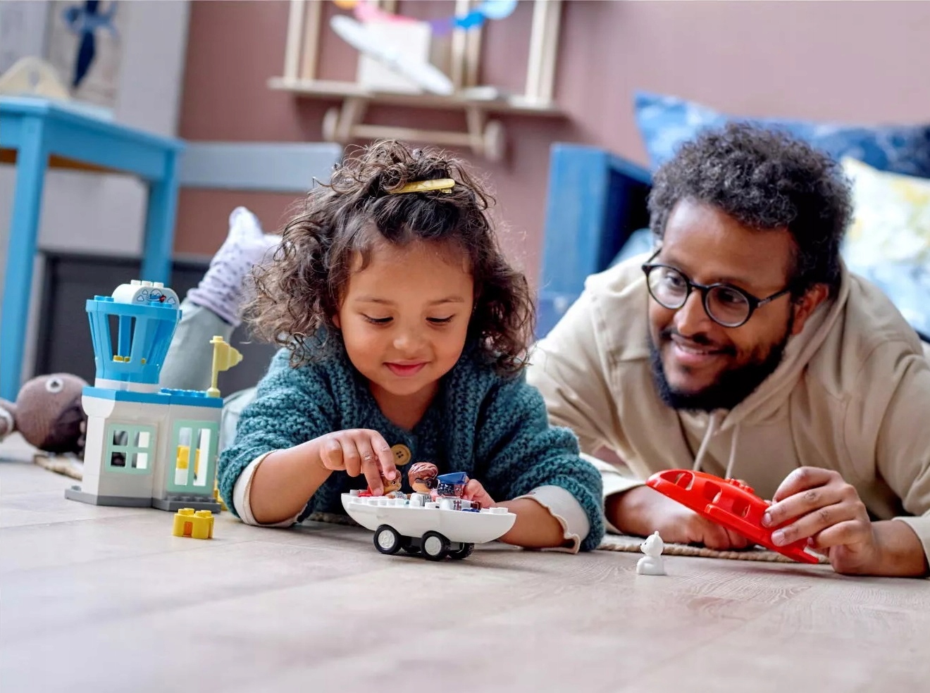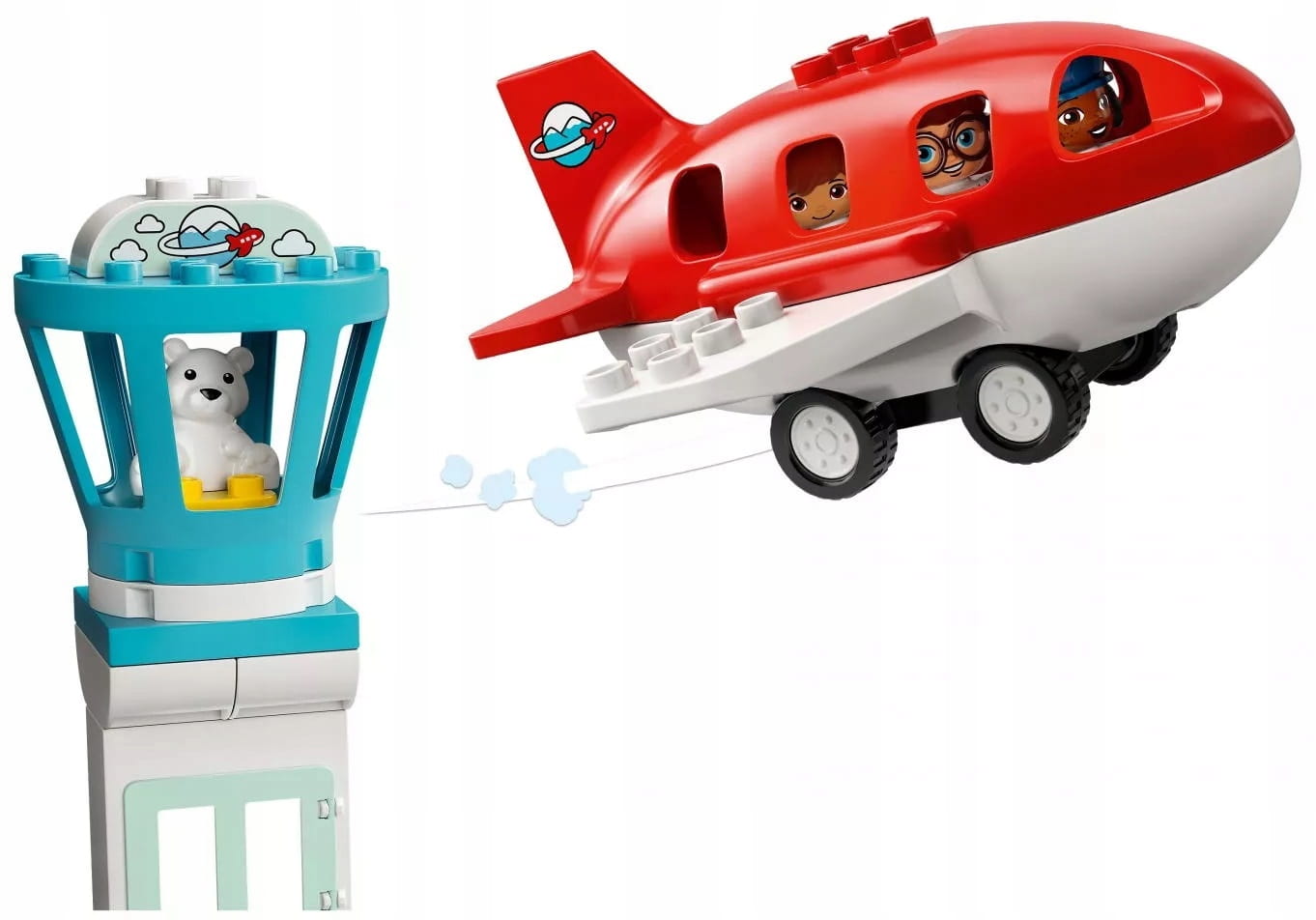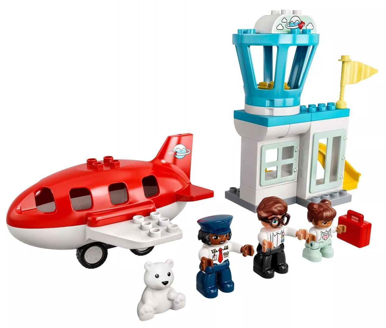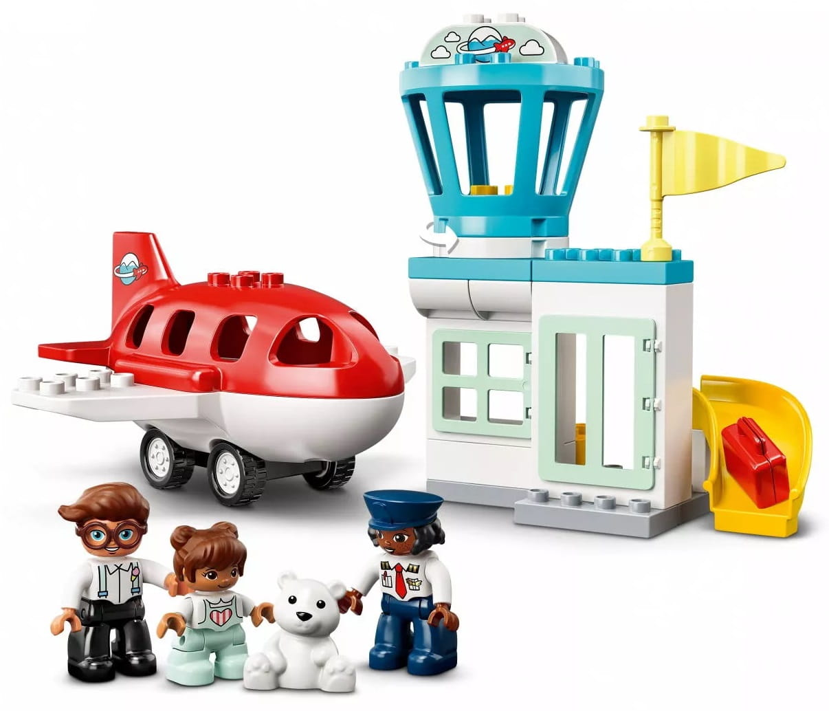 - W komplecie trzy figurki DUPLO® — tata, dziewczynka i pilot — a także samolot ze zdejmowanym dachem, obracana wieża kontroli lotów oraz zjeżdżalnia dla bagaży.