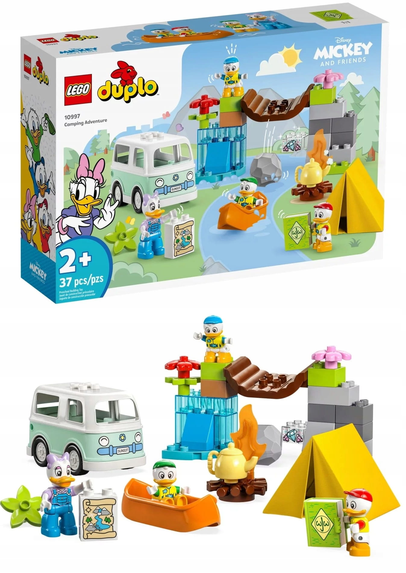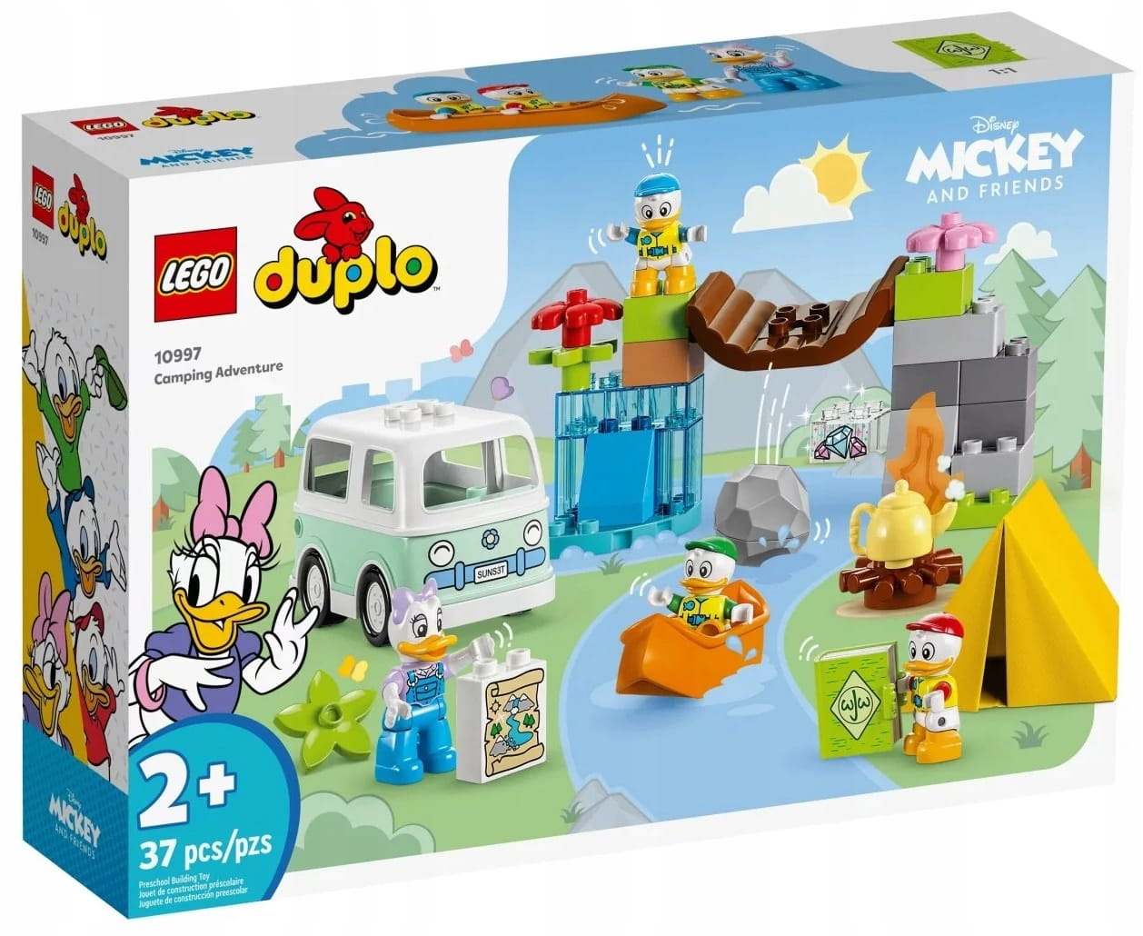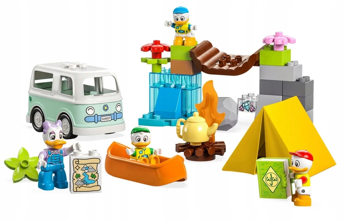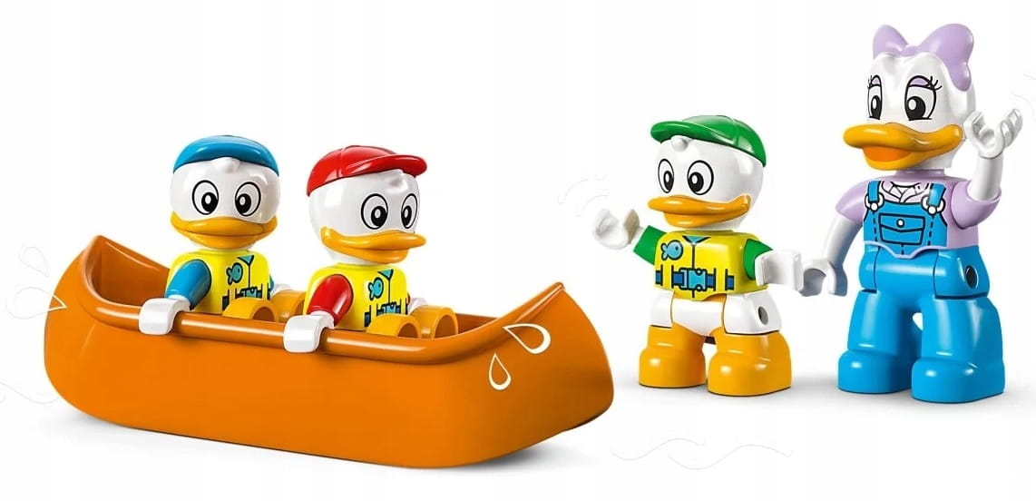 - Mnóstwo znajomych postaci — w zestawie jest canoe, kamper, który jeździ i tekstylny namiot, a także cztery figurki LEGO® DUPLO®: Kaczka Daisy oraz siostrzeńcy Hyzio, Dyzio i Zyzio Disneya