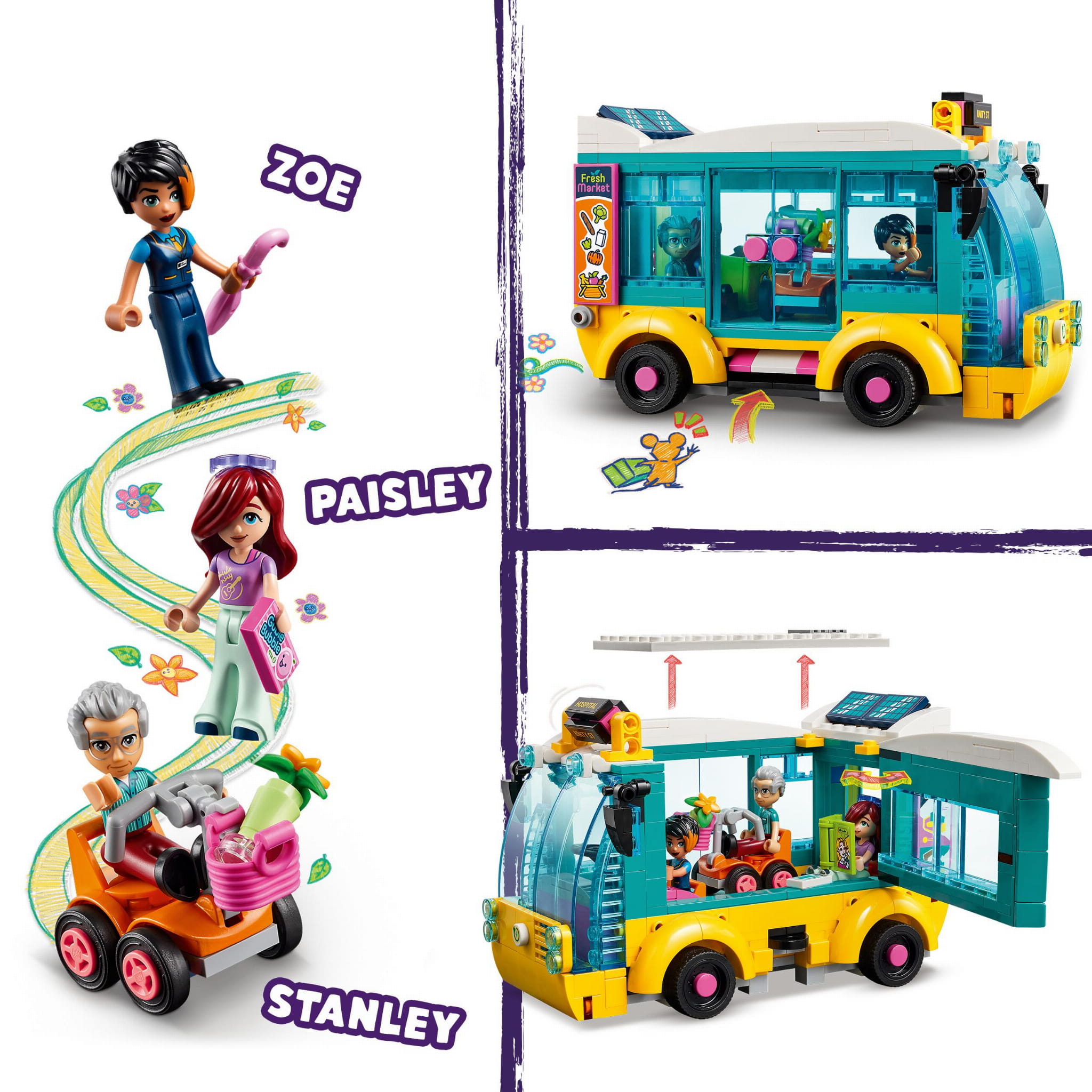 - Trzy postacie i akcesoria — w zestawie znajdują się postacie LEGO® Friends: Paisley, a także kierowca autobusu i pasażer ze skuterem inwalidzkim