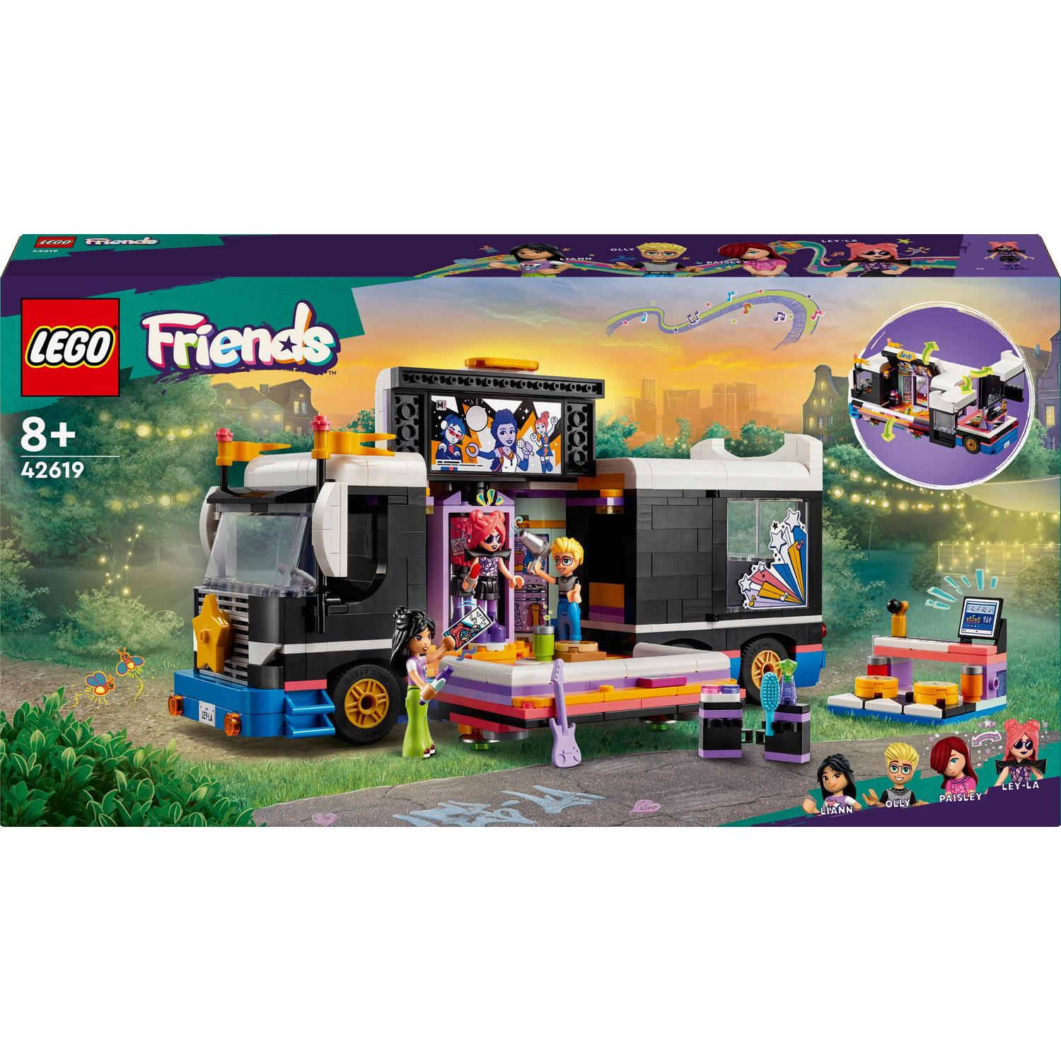 - Zestaw z autobusem do zabawy w gwiazdę muzyki — zestaw LEGO® Friends Autobus koncertowy gwiazdy popu dla ośmiolatków i starszych dzieci zawiera cztery minilaleczki i mnóstwo akcesoriów