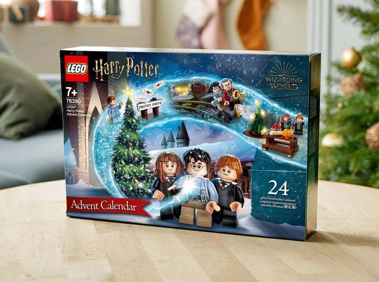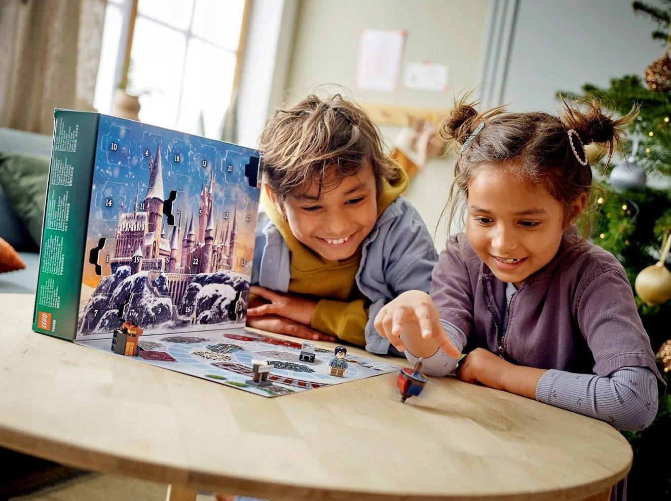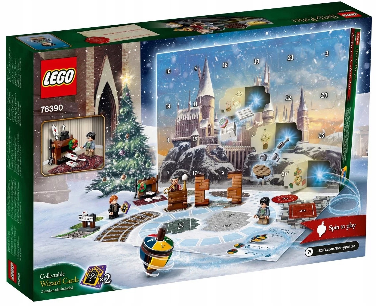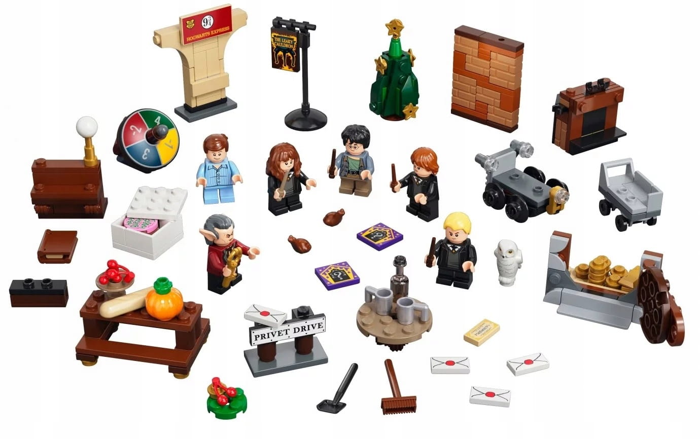Za każdymi z 24 drzwiczek kryje się inny prezent. W pudełku czeka sześć minifigurek — Harry Potter, Ron Weasley™, Hermiona Granger™, Draco Malfoy™, Dudley Dursley i Gryfek — a do tego wyjątkowe przedmioty i akcesoria znane z filmów o Harrym Potterze. W miarę zbliżania się świąt, dzieci będą łączyć ze sobą zabawki, by móc odgrywać historyjki o tym, jak Harry trafił z Privet Drive do Hogwartu™: o listach z Hogwartu, które wleciały przez kominek, o złocie ze skarbca Gringotta, o wybieraniu przyborów szkolnych oraz o spotkaniu z sową Hedwigą™. Jeszcze więcej radości da dzieciom ciekawa gra z kolorowym bączkiem. Możliwości jest tyle, że magia potrwa cały rok! Zestaw zawiera również dwie losowe płytki kart czarodziejów (kolekcja liczy w sumie 16 sztuk).