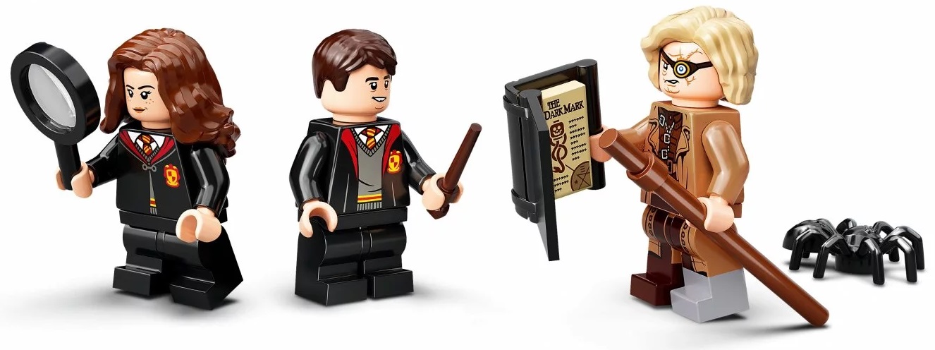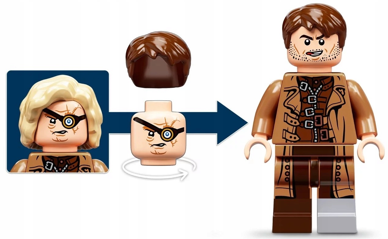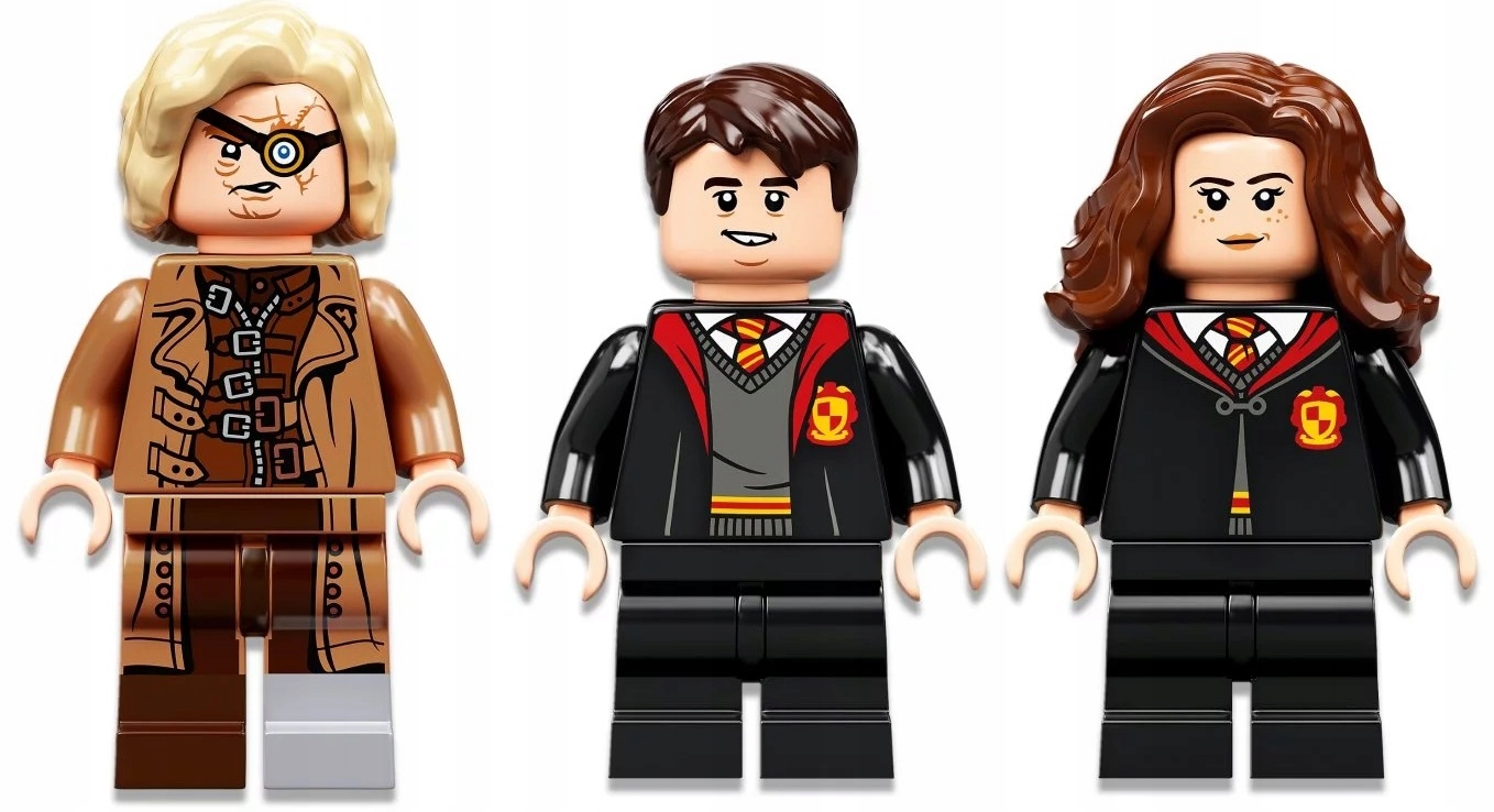 - Tak jak w filmach — minifigurkę Szalonookiego Moody’ego można zamienić w Barty’ego Croucha Jr., obracając jego głowę i zamieniając włosy. W skrzyni znajduje się mikrofigurka prawdziwego Szalonookiego Moody’ego