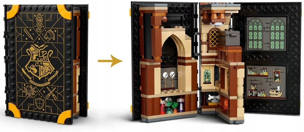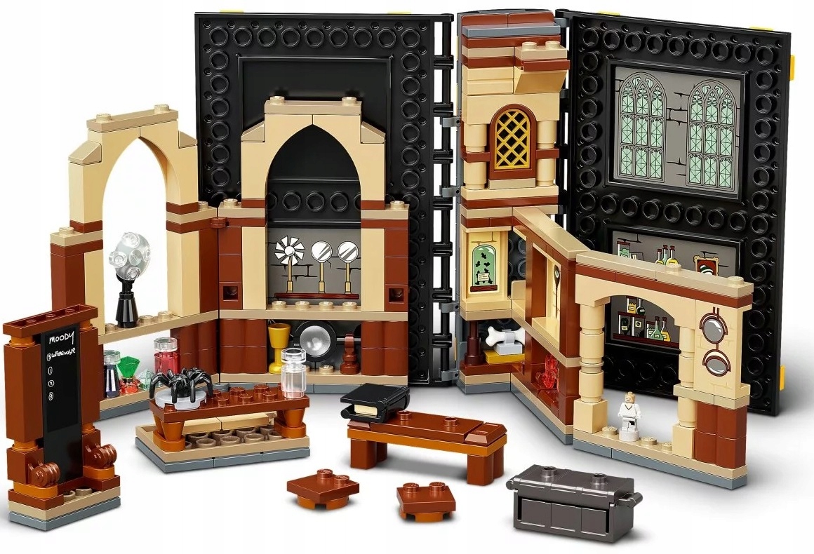Pod ozdobną okładką kryje się fascynująca sala lekcyjna pełna zaczarowanych przygód. Są tu trzy minifigurki — Szalonooki Moody, Hermiona Granger™i Neville Longbottom™ — oraz sporo fajnych akcesoriów. Niektóre elementy, takie jak półki i kominek, są wbudowane, a inne można odczepić i wyjąć, by zrobić więcej miejsca na zabawę — są to na przykład tablica, skrzynia, butelki z eliksirami, ławki i krzesła. Zestaw można połączyć z innymi z tej samej serii i złożyć w poręczną książkę, więc dzieci mogą wziąć go ze sobą w dowolne miejsce i w łatwy sposób przechowywać na półce po zabawie.