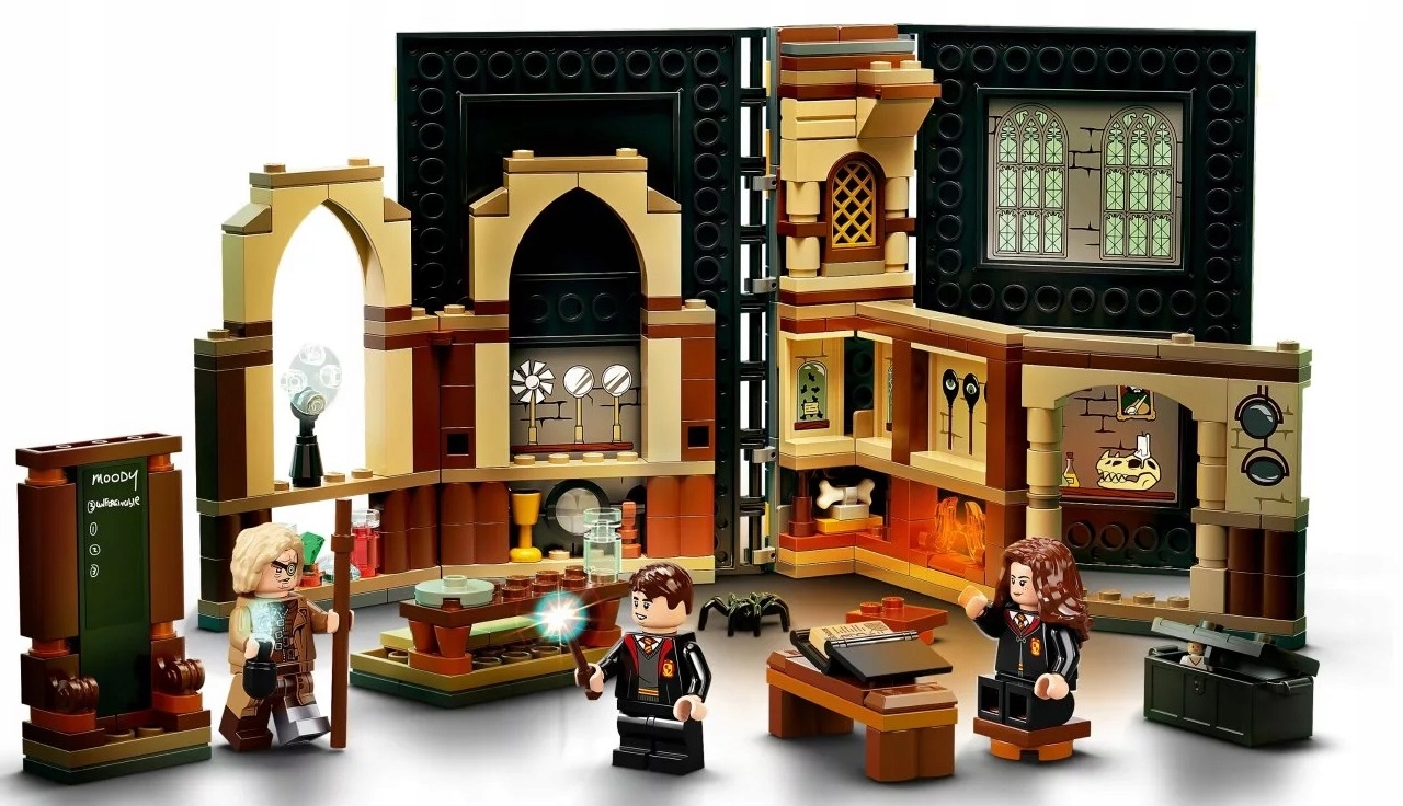 - Magiczna rozrywka — po otworzeniu tej książki LEGO® dzieci trafią na zajęcia z obrony przed czarną magią profesora Moody’ego. Za ścianą jest jego biuro ze skrzynią, w której uwięziony jest miniaturowy Moody!