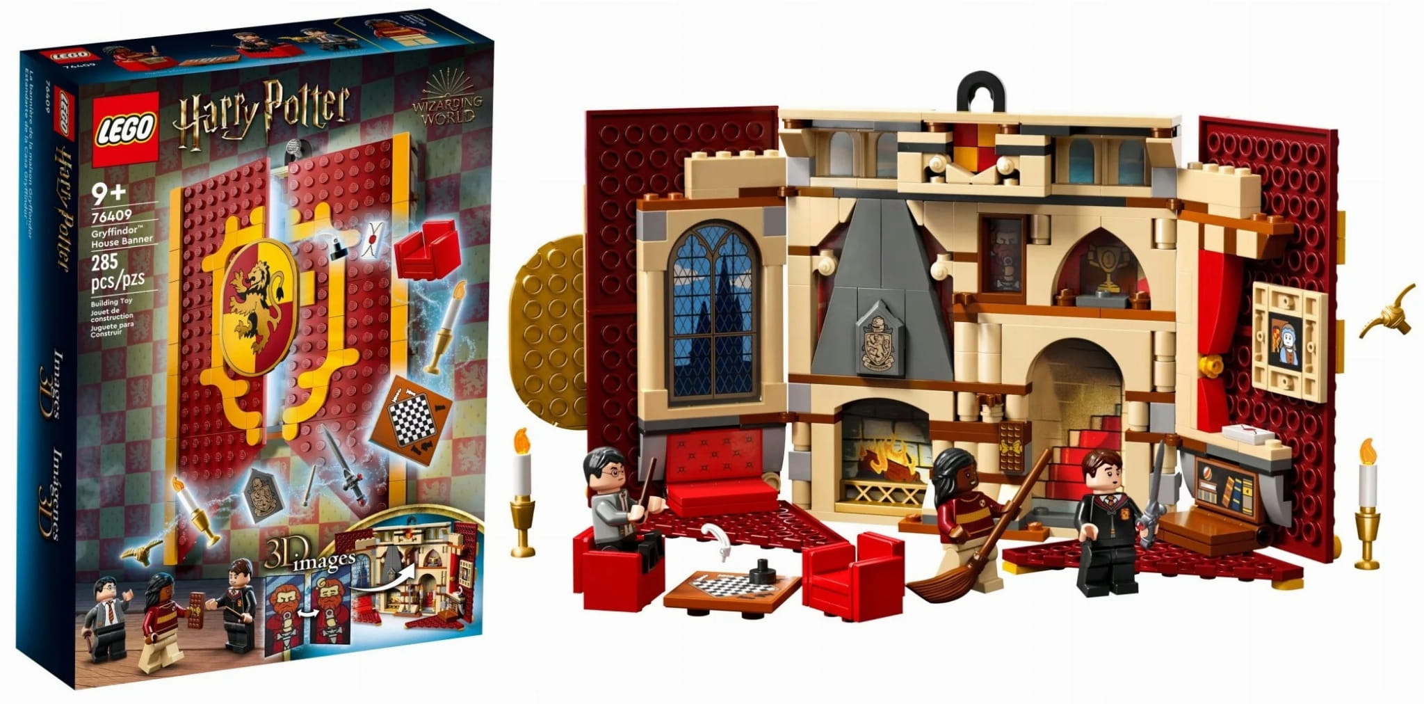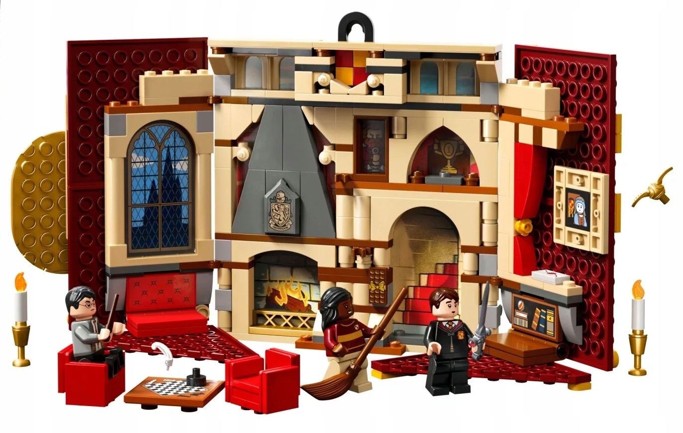 - Autentyczne detale – flaga przedstawia herb Gryffindoru™ i otwiera się, ukazując zbudowany z klocków pokój wspólny, w tym kominek, siedzenia i świece na świecznikach oraz szachownicę